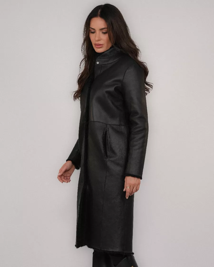 This elegant, reversible sheepskin coat, made of 100% merino leather, combines luxury, functionality, and timeless style. On one side, it looks like soft, fluffy fur, and when reversed, it has a smooth, leather-like finish with a subtle sheen.