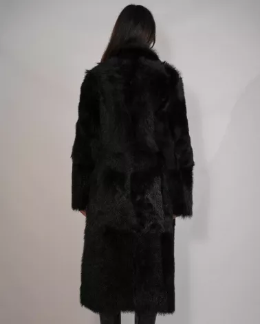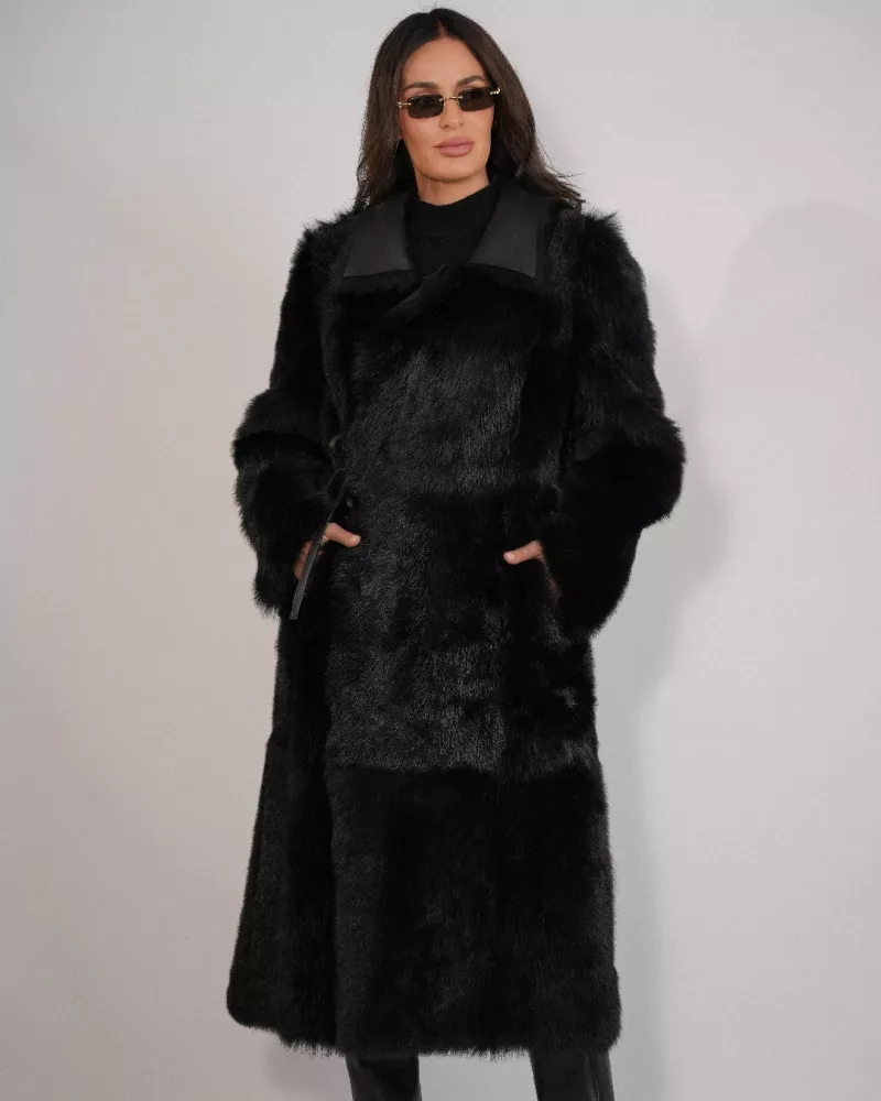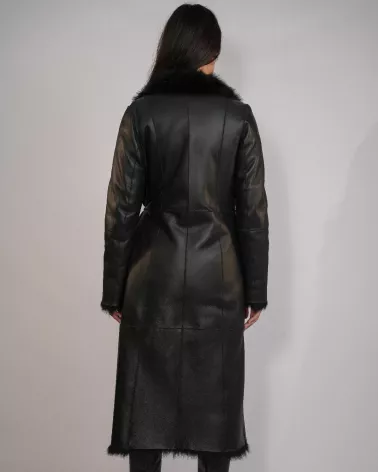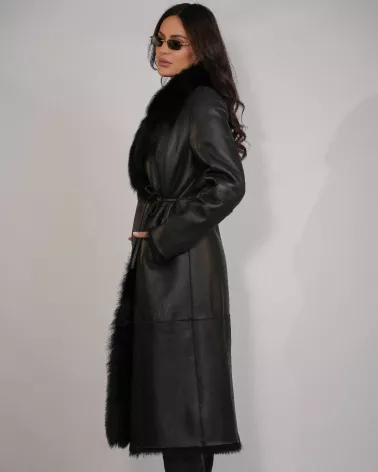 This sheepskin coat has a classic, elongated shape, 120 cm long, that beautifully slims the figure and provides excellent protection from the cold. A tie belt made of full-grain leather accentuates the waist and allows for a personalized fit. Two slit pockets add practicality and subtly complement the minimalist design.