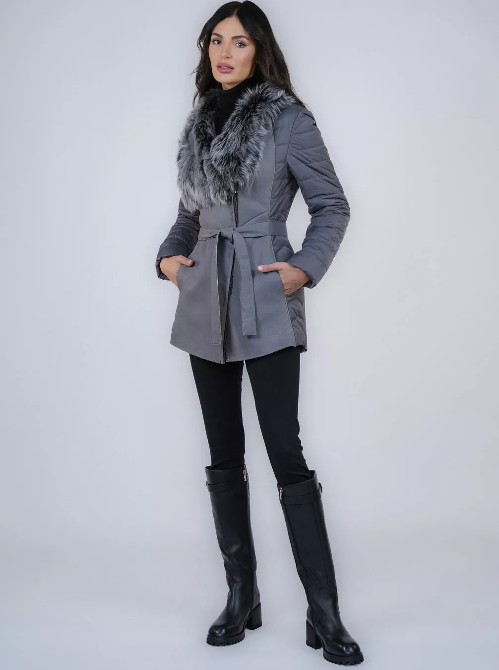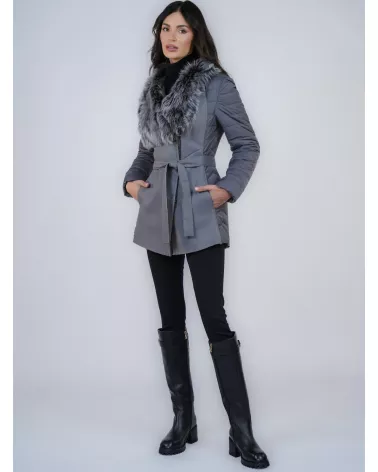 This stylish and functional women's sheepskin coat in a classic gray color is a perfect choice for cold days. The fitted cut beautifully accentuates the silhouette, giving the overall look a feminine and elegant touch. It features a striking collar trimmed with natural fox fur, adding a luxurious finish and providing additional protection against the cold.
