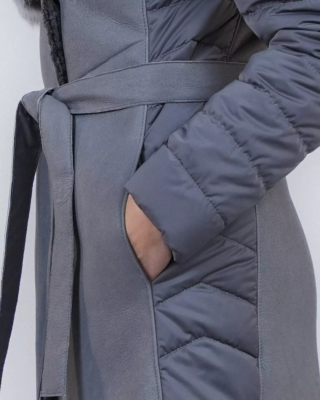 The sleeves and sides are made of quilted textile, which not only enhances the design but also increases comfort. The sleeves are lined with light, warm eco-down, ensuring adequate thermal insulation. The sheepskin coat has a separate full-grain leather belt that allows for a perfect fit at the waist.