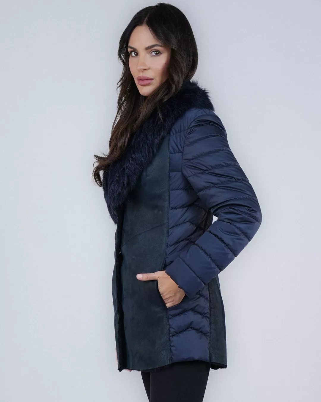 Women's Navy Sheepskin Coat – Fitted with a Fox Fur Collar