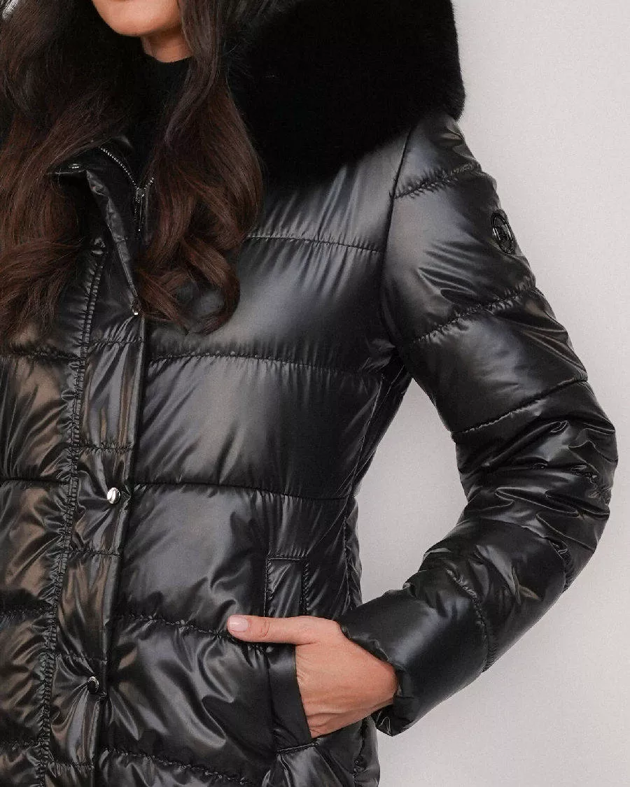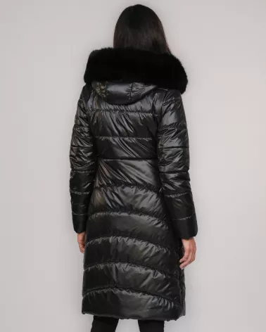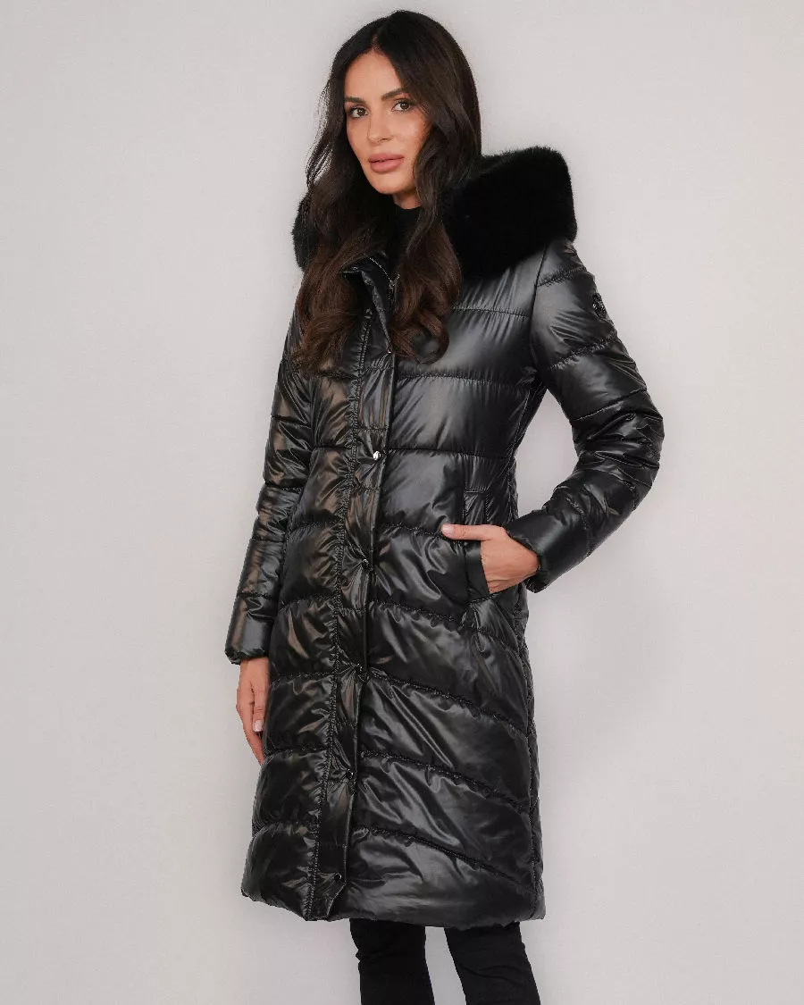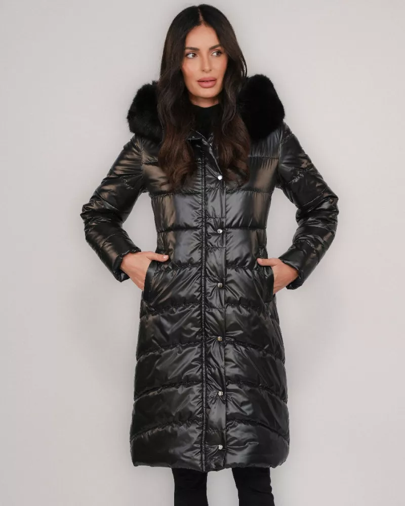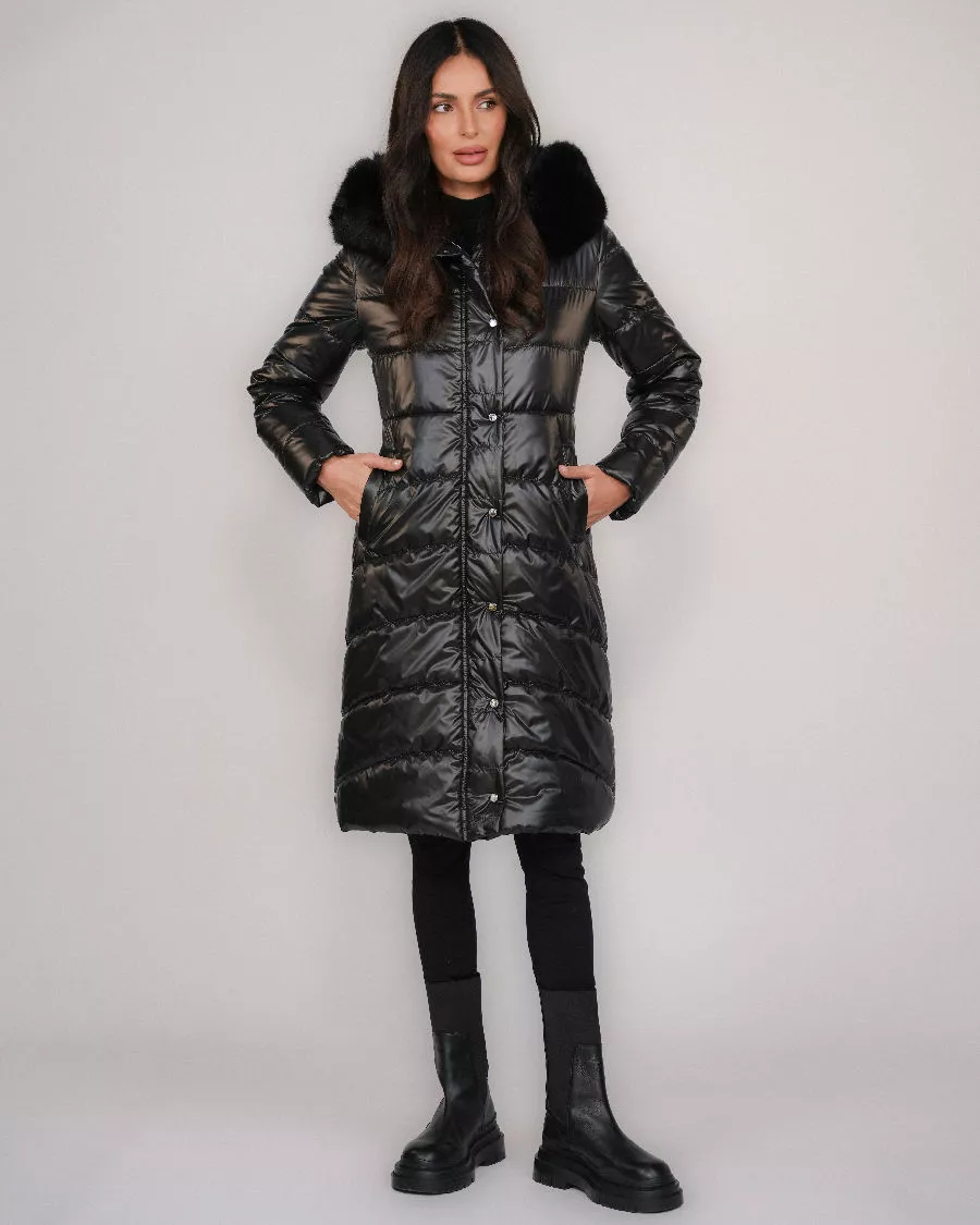 This elegant, long, 105 cm down jacket in classic black is the perfect blend of style and functionality for winter days. The tailored cut beautifully accentuates the figure while maintaining complete comfort and freedom of movement. It features a generous hood trimmed with natural fox fur – the fur trim can be detached if necessary, increasing the jacket's versatility.