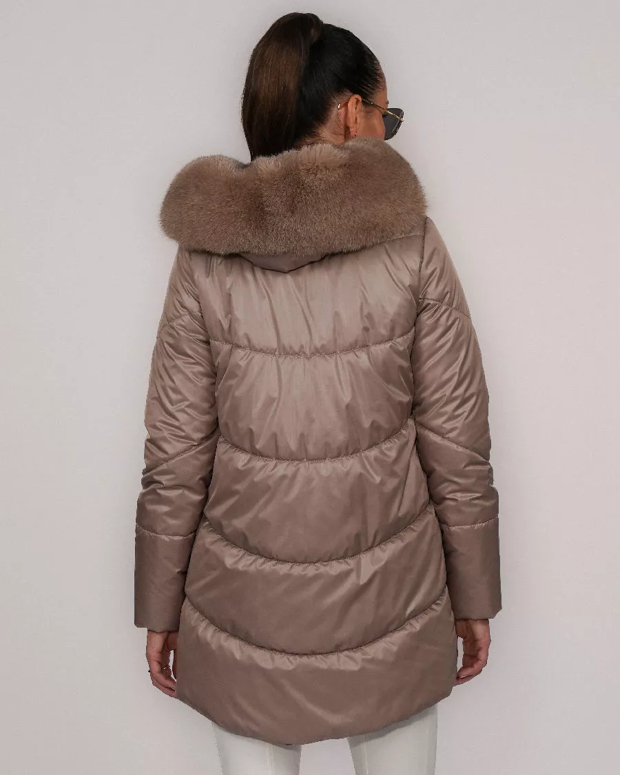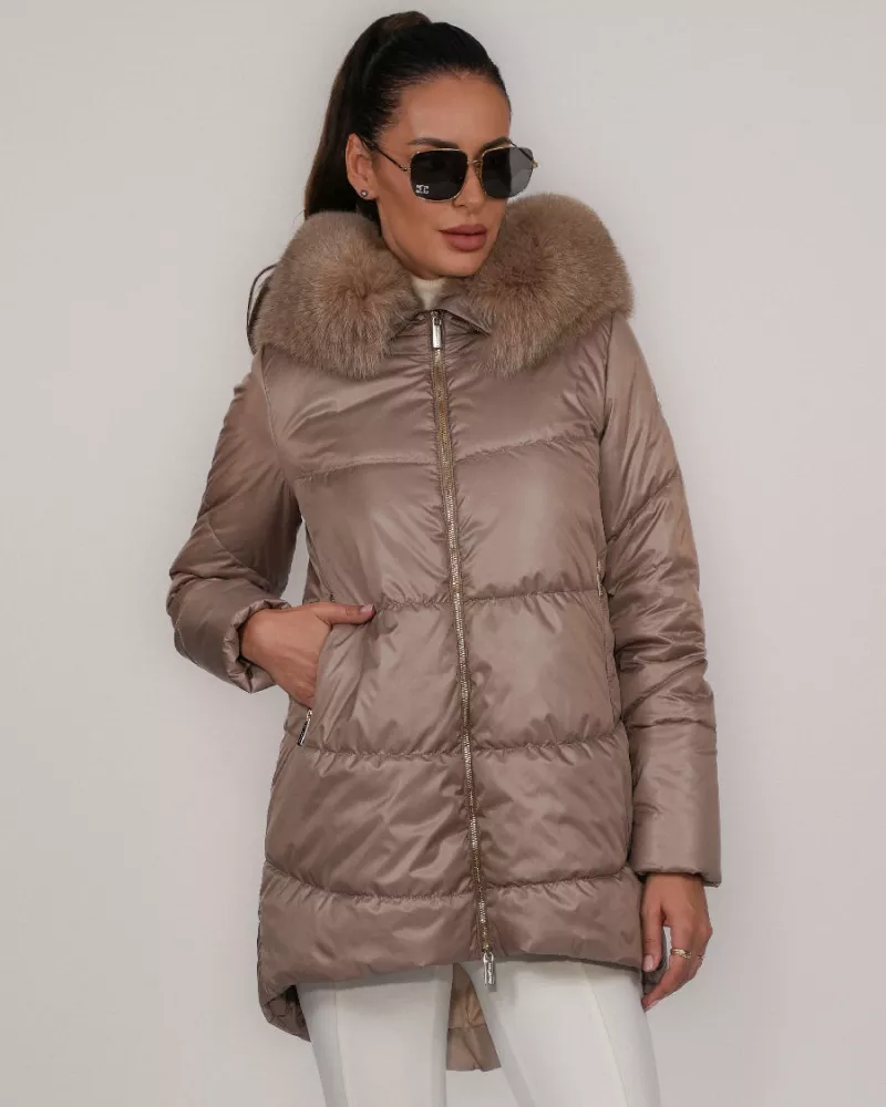 The hood is luxuriously trimmed with natural fox fur—soft, thick, and incredibly striking. Importantly, the fur trim can be detached at any time, giving the jacket two distinct looks: elegant or sporty.