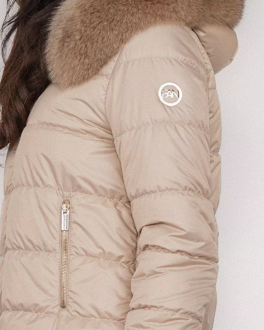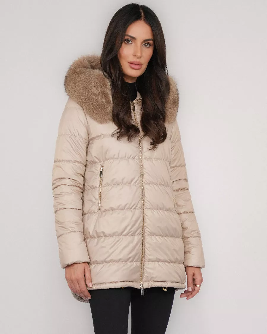 It features a generous hood luxuriously trimmed with natural fox fur (the trim is detachable, making it easy to match the jacket to the occasion). The jacket fastens with a zipper, and there are two practical zippered pockets on the sides.