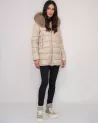 This elegant women's down jacket in camel is the perfect choice for the colder months. At approximately 85 cm long, its relaxed fit allows for ease of movement and comfort—perfect for both everyday wear and more elegant outfits.