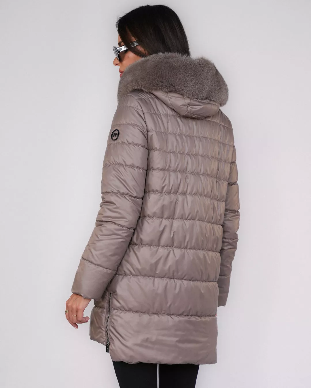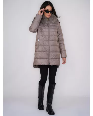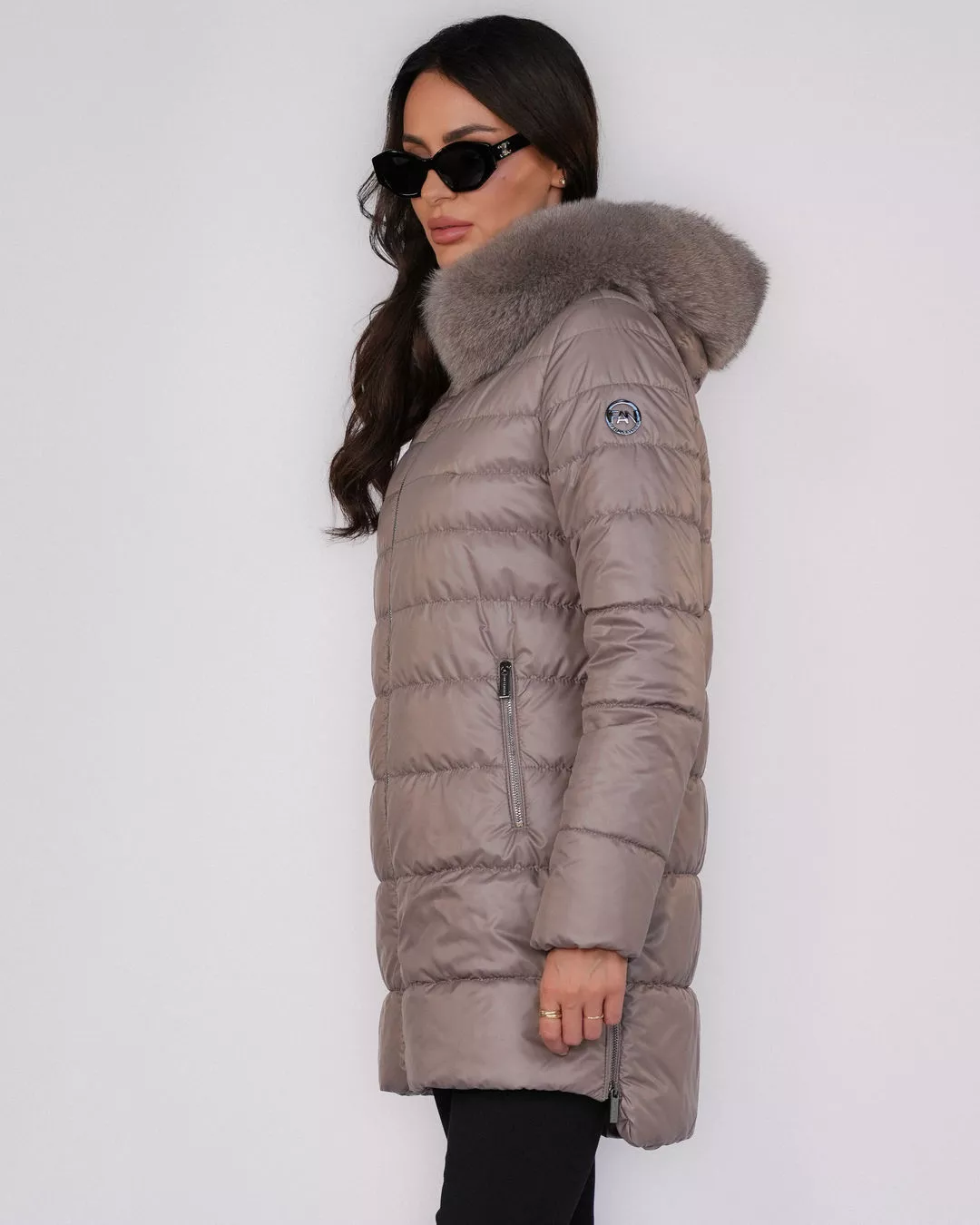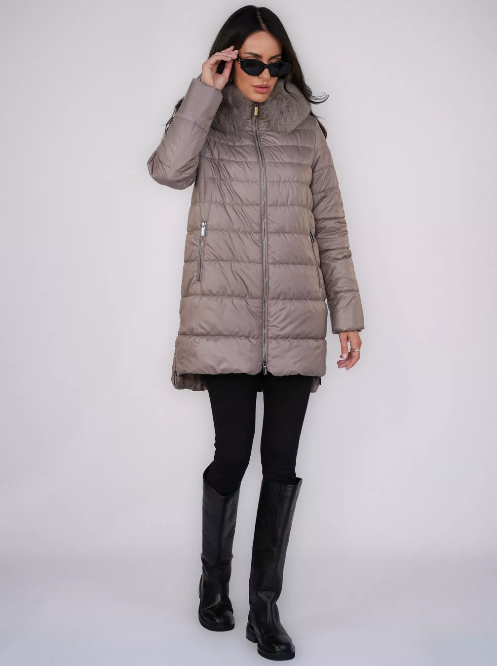 This stylish and incredibly practical down jacket in an elegant, timeless taupe color is the perfect choice for cold days. It provides excellent thermal comfort while accentuating the feminine character of the outfit.