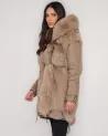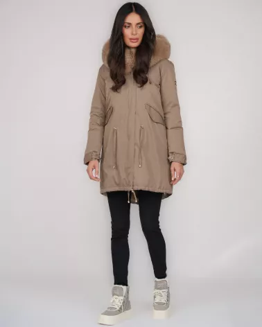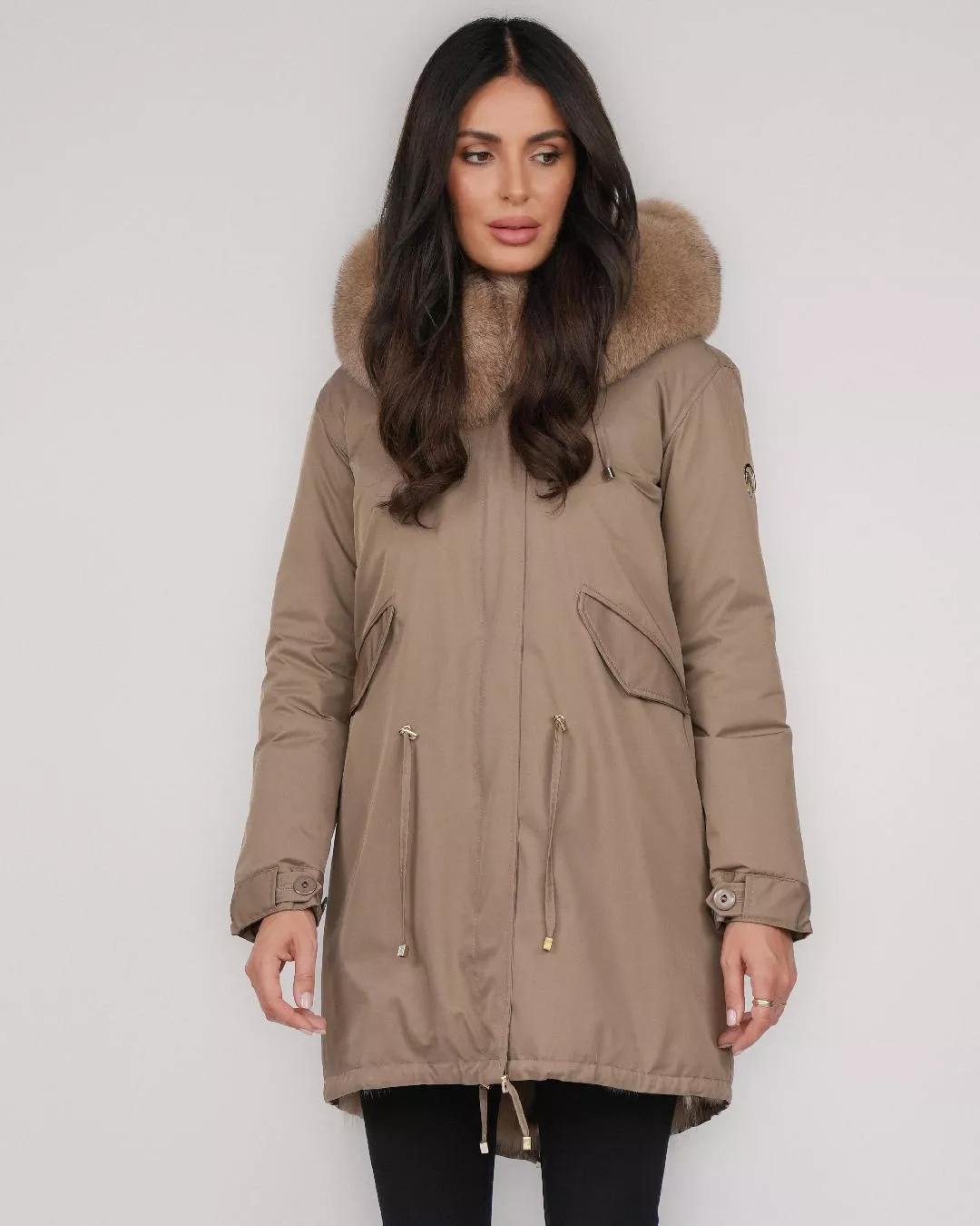 This elegant and functional parka in camel combines modern design with luxurious finishes. The reversible model features a classic, waterproof parka on one side and a striking version with natural fox fur on the other, perfect for cooler days. This piece is perfect for women who value style, comfort, and the highest quality craftsmanship.