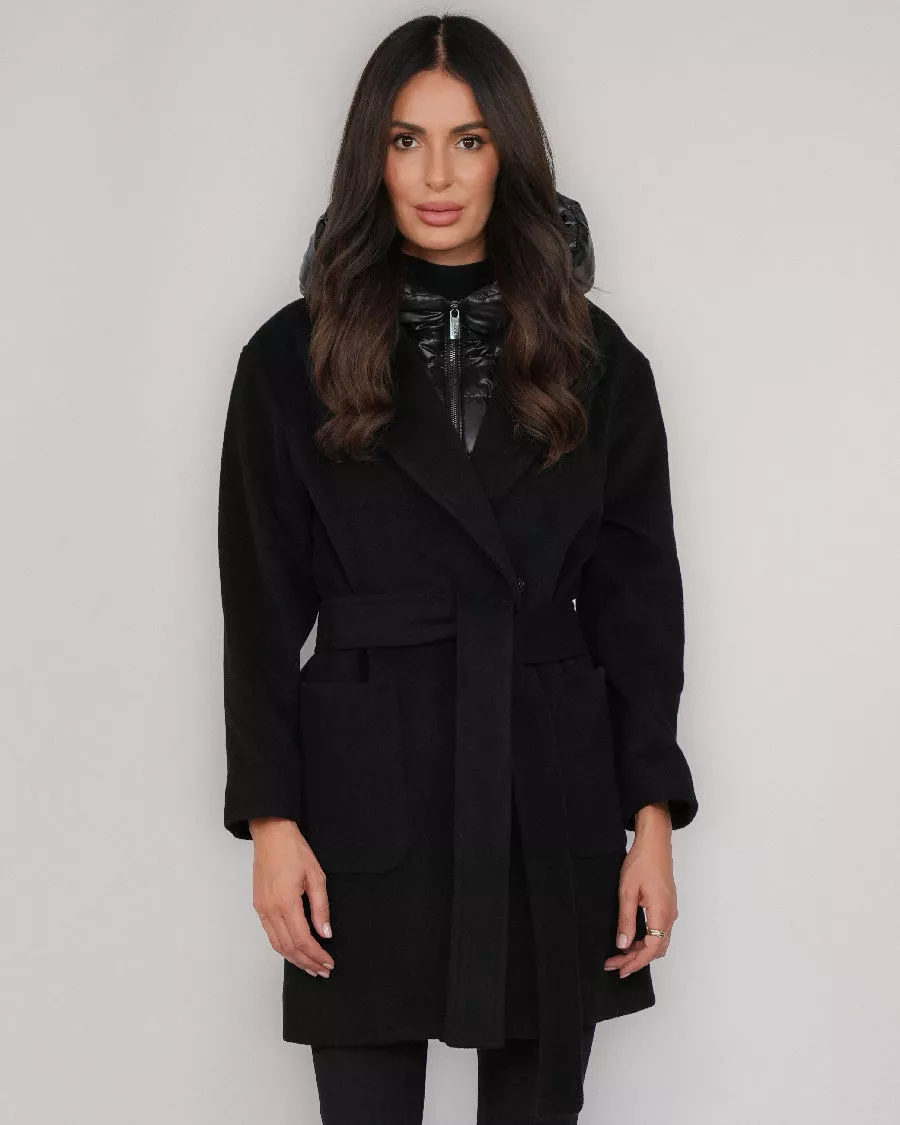 This elegant, loose-fitting coat, made from a high-quality wool and cashmere blend, is the perfect choice for colder days. It features a detachable hooded liner filled with eco-down for added warmth and comfort. This detachable lining makes it perfect for both transitional seasons and winter.