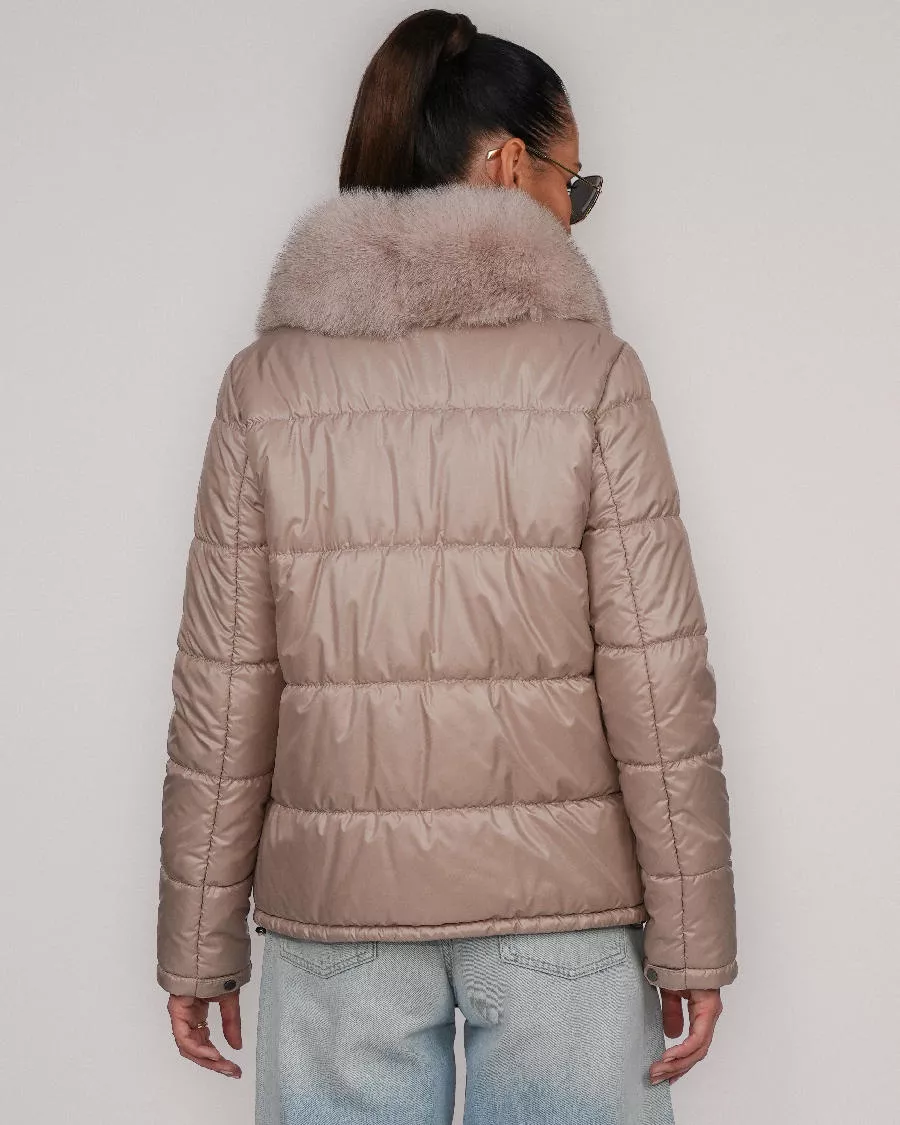 Dieses Modell verfügt über einen hohen Stehkragen mit einem Kragenbesatz aus echtem Fuchsfell, der der Jacke einen luxuriösen Touch verleiht. Der Pelzbesatz ist abnehmbar und ermöglicht so eine individuelle Anpassung – von elegant bis lässig.