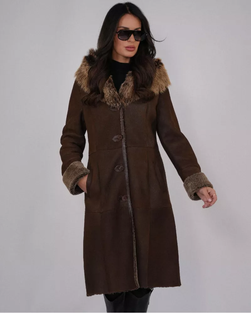 Dieses Modell verfügt über eine praktische Kapuze mit Naturfellbesatz, die dem Mantel eine stilvolle Note verleiht. Der Knopfverschluss betont die klassische Form des Mantels, während zwei funktionelle Taschen den Tragekomfort im Alltag erhöhen. Hochkrempelbare Ärmel ermöglichen eine individuelle Längenanpassung und bringen die weiche Oberfläche des Fells optimal zur Geltung.