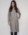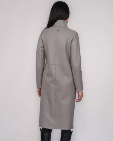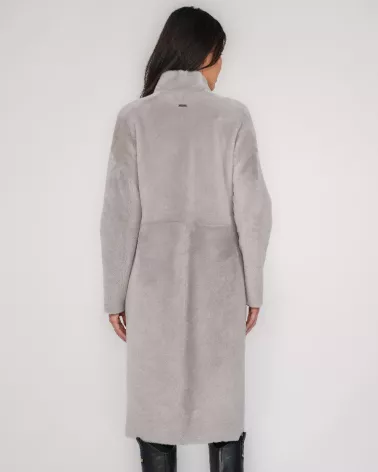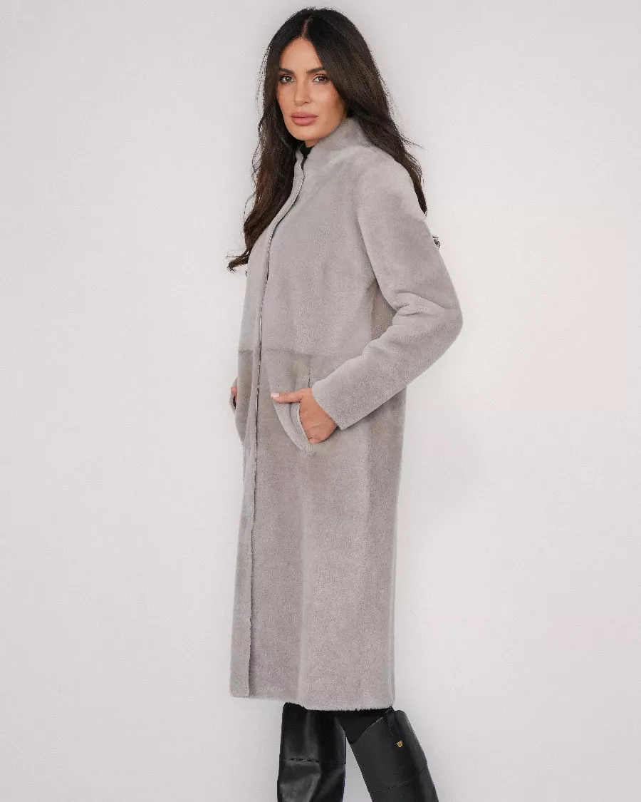 Das 110 cm lange Modell hat einen schlichten, klassischen Schnitt und einen Stehkragen für zusätzlichen Stil und effektiven Kälteschutz. Dank des wendbaren Designs können Sie den Mantel auf zwei Arten tragen – mit einer weichen, flauschigen Oberfläche auf der einen und einer glatten, lederähnlichen Oberfläche in mattem Grau auf der anderen Seite.