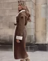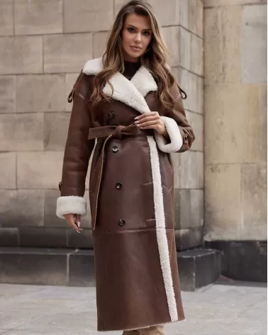 Ein eleganter langer Schaffellmantel von FAN LEATHER, der in dieser Saison komplett aus Merino-Lammfell in der modischen Walnussfarbe gefertigt ist, ist ein Angebot für Frauen, die eine Art Kompromiss zwischen thermischem Komfort und stilvollem Aussehen suchen. Es funktioniert auch bei niedrigen Temperaturen hervorragend, schützt vor Kälte und Wind und verleiht jedem Anlass einen originellen Look.