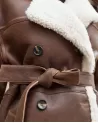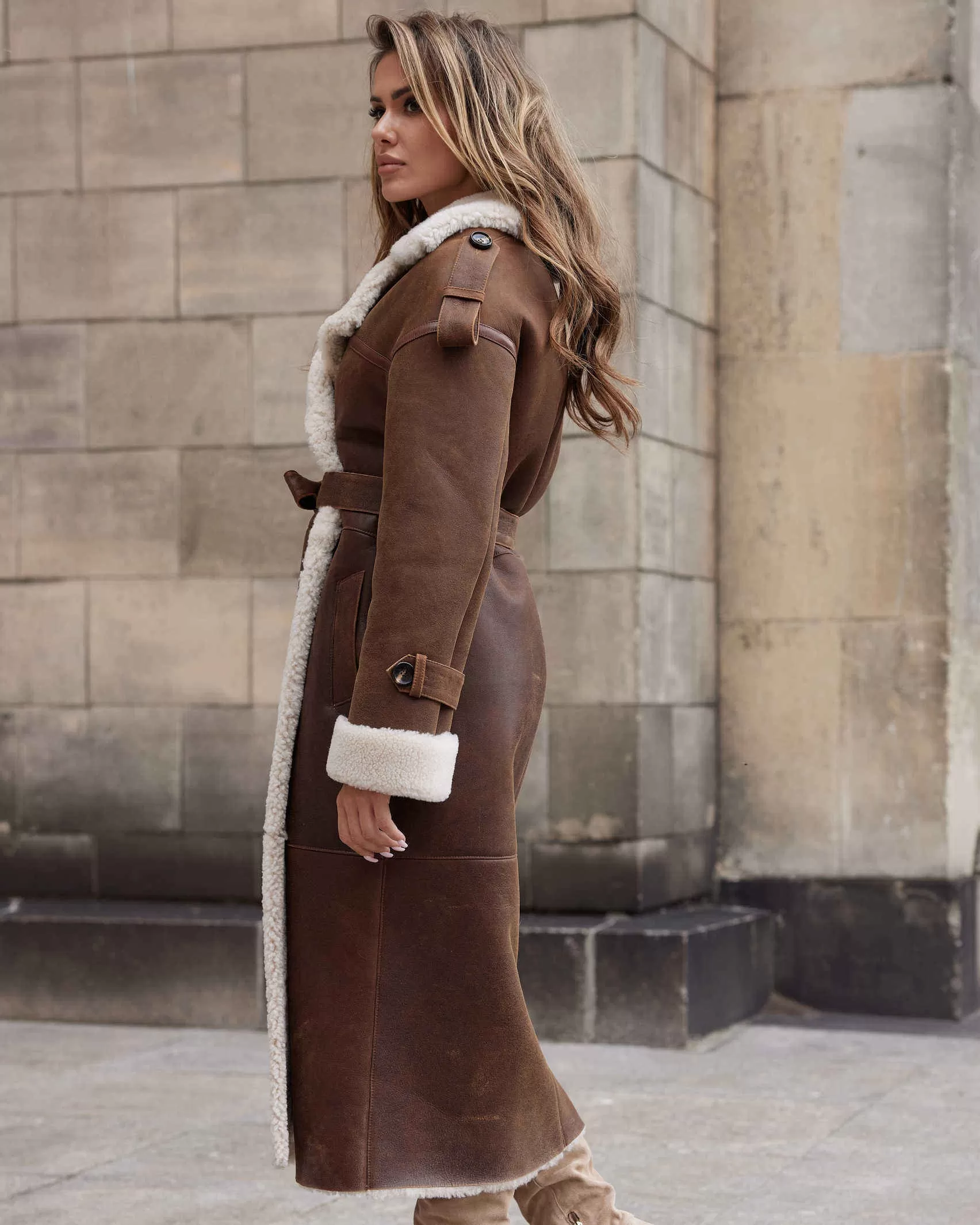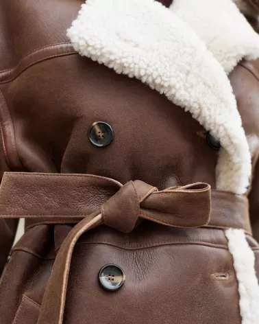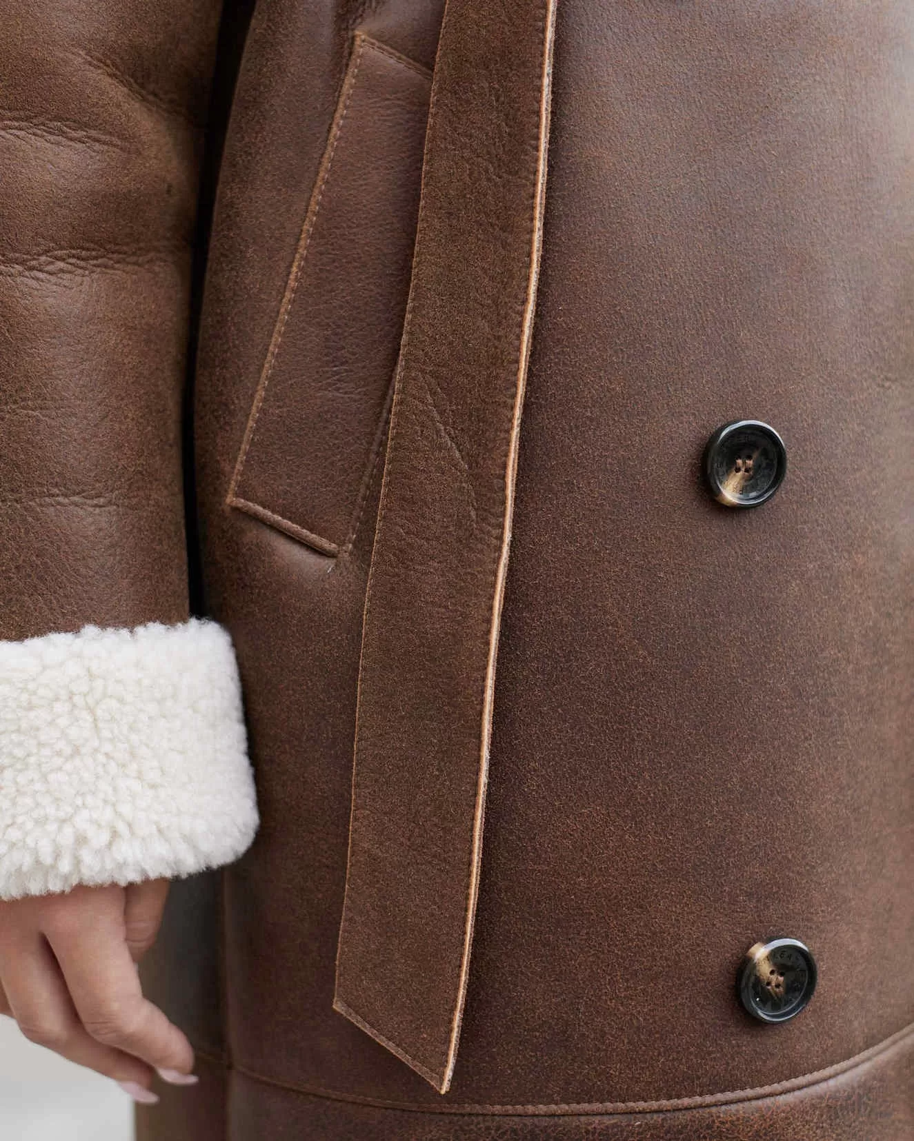 Sie können sicher sein, dass Sie mit einem langen, walnussfarbenen Schaffellmantel mit weißem Finish das Interesse Ihrer Mitmenschen wecken werden. Dieser Mantel ist äußerst stilvoll und daher ein echter Hingucker. Dabei spielen Details wie schwarze Knöpfe oder ein in der Taille gebundener Gürtel eine wesentliche Rolle, die eine perfekte Ergänzung darstellen.