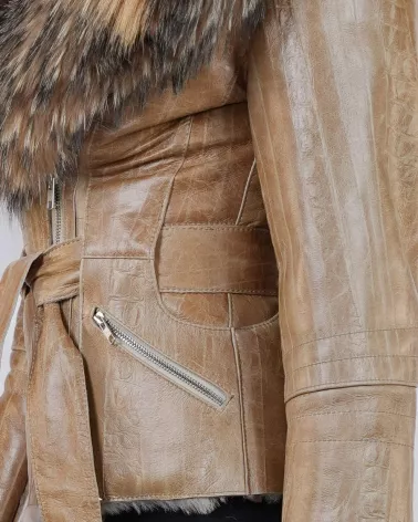 Dieser elegante, taillierte Damen-Lammfellmantel ist aus hochwertigem, geprägtem Lammleder in einem modischen Beigeton gefertigt. Der taillierte Schnitt und der separate Vollnarbenledergürtel ermöglichen eine individuelle Anpassung an die Taille und schmeicheln der Figur. Der markante Kragen mit natürlichem Waschbärfellbesatz verleiht dem Mantel einen luxuriösen Touch und spendet zusätzliche Wärme an kälteren Tagen.