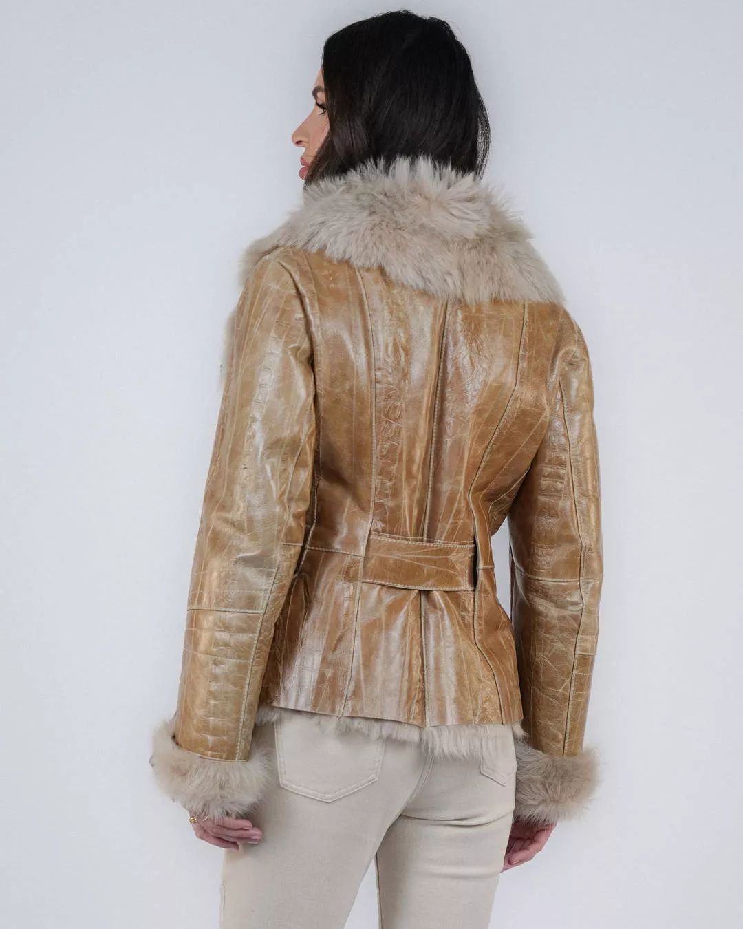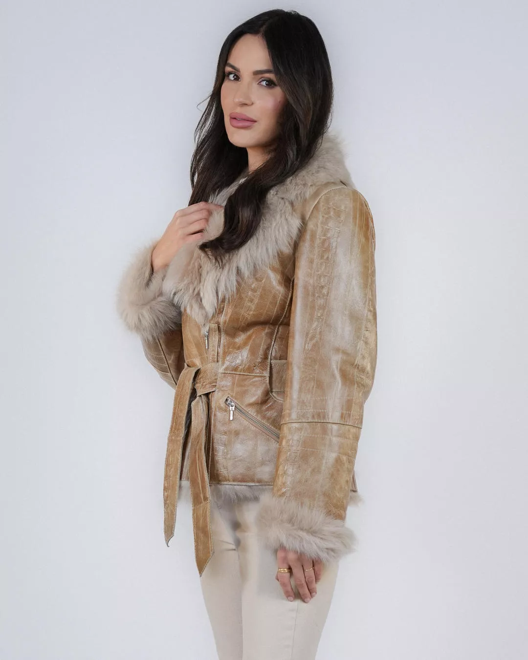 Dieser elegante, kurze Damen-Lammfellmantel ist aus 100 % hochwertigem toskanischem Lammfell (spanisches Lamm) gefertigt. Das modische, taillierte Design betont die Silhouette und bietet gleichzeitig hohen Tragekomfort und optimalen Schutz vor Kälte. Die beige Farbe und die geprägte Lederstruktur verleihen ihm einen luxuriösen Touch.
