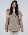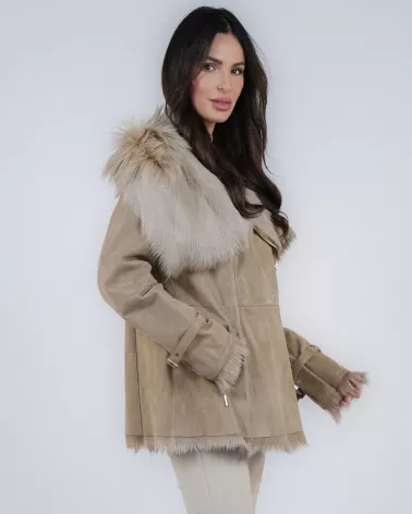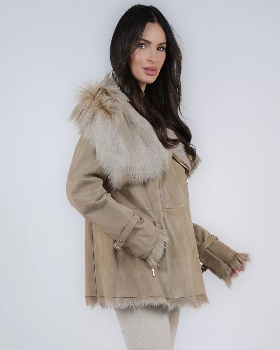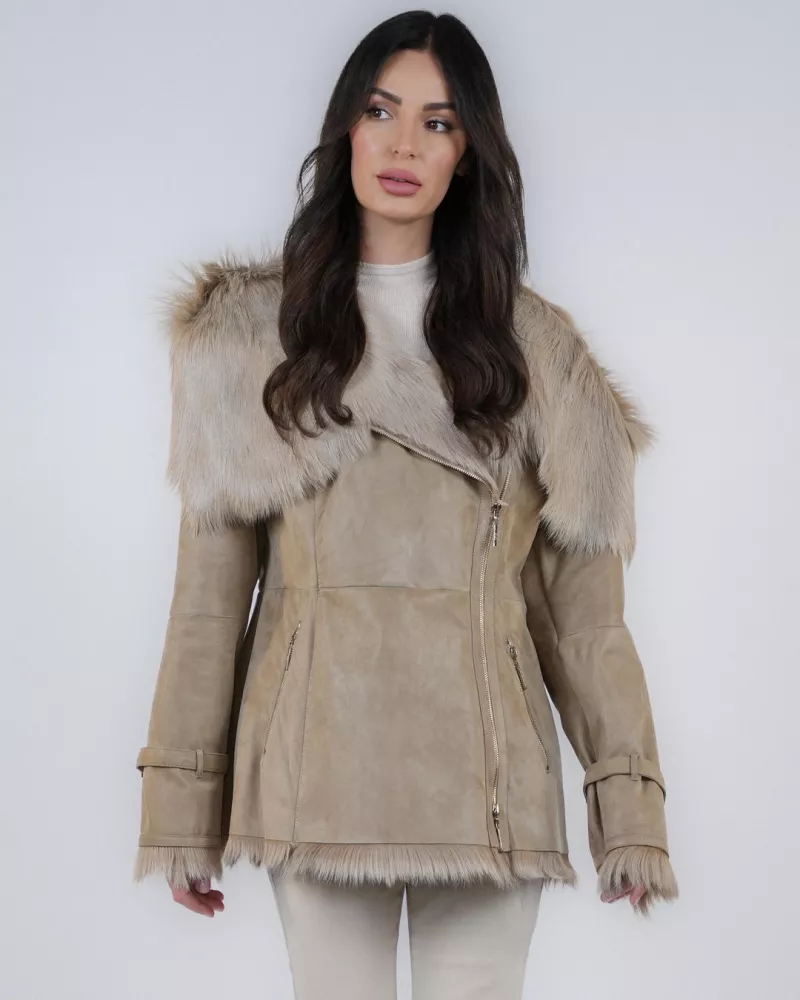Beigefarbener Damen-Ziegenfellmantel mit Kapuze