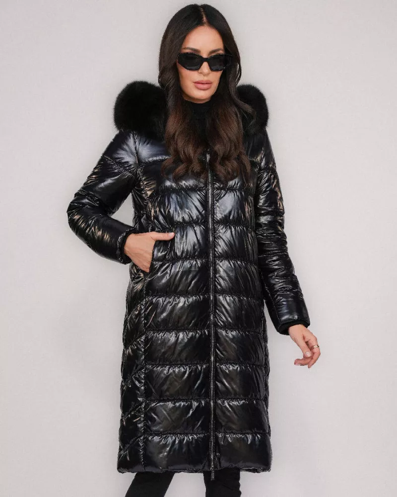 Diese elegante Damen-Daunenjacke in tiefem Schwarz vereint Luxus, Funktionalität und zeitlosen Stil. Ihr raffinierter Schnitt mit einer Länge von 110 cm schmeichelt der Figur und schützt gleichzeitig effektiv vor Kälte.