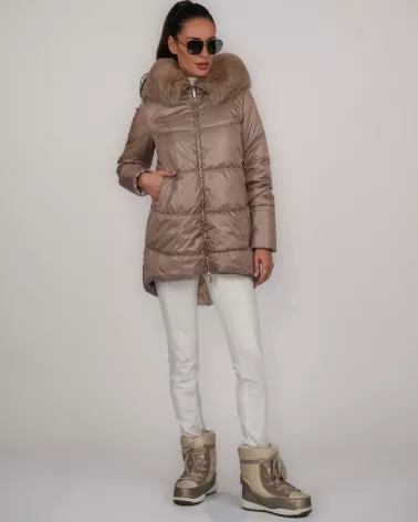 Beigefarbene, isolierte Daunenjacke mit Kapuze