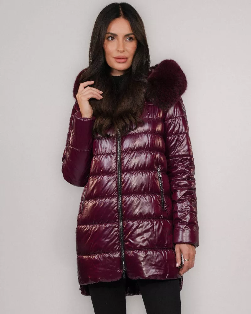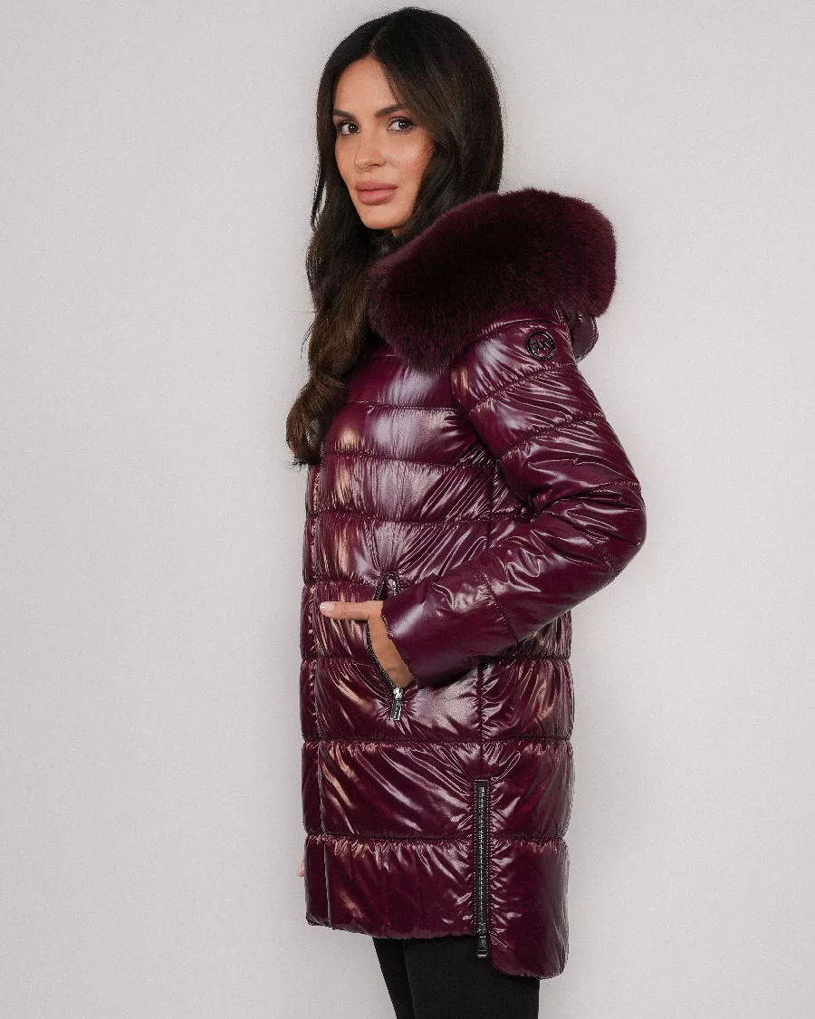 Burgunderrote Daunenjacke mit natürlichem Fuchspelz