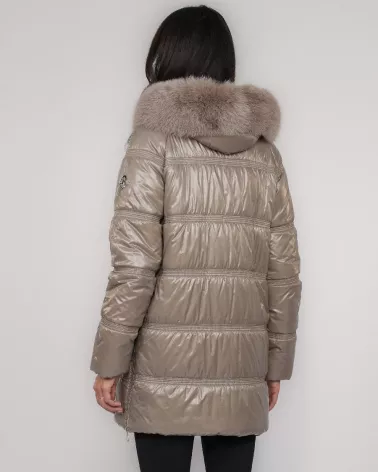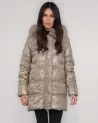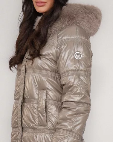 Diese elegante, warme taupefarbene Daunenjacke ist die perfekte Wahl für kalte Tage. Das 85 cm lange Modell vereint Stil und Funktionalität und bietet Komfort und Schutz vor Kälte.