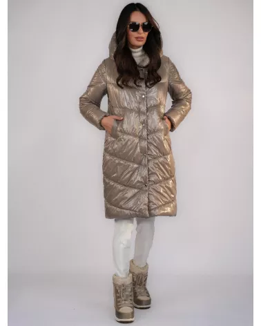 Diese lange Daunenjacke ist stilvoll, funktional und perfekt für kalte Tage. Sie vereint Eleganz mit hervorragendem Wärmeschutz. Gefertigt aus wasserabweisendem, glänzendem Nylon, passt sie sowohl zu lässigen als auch zu eleganten Outfits.