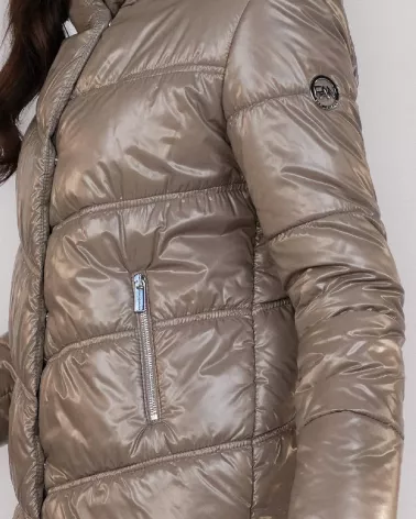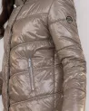 Diese stylische und funktionelle taupefarbene Daunenjacke bietet maximalen Wärmekomfort an kalten Tagen. Gefertigt aus 100 % wasserabweisendem Nylon, schützt sie effektiv vor Nässe und verleiht ihr mit ihrem leicht glänzenden Finish eine moderne, elegante Note.