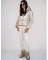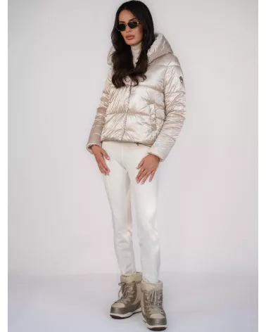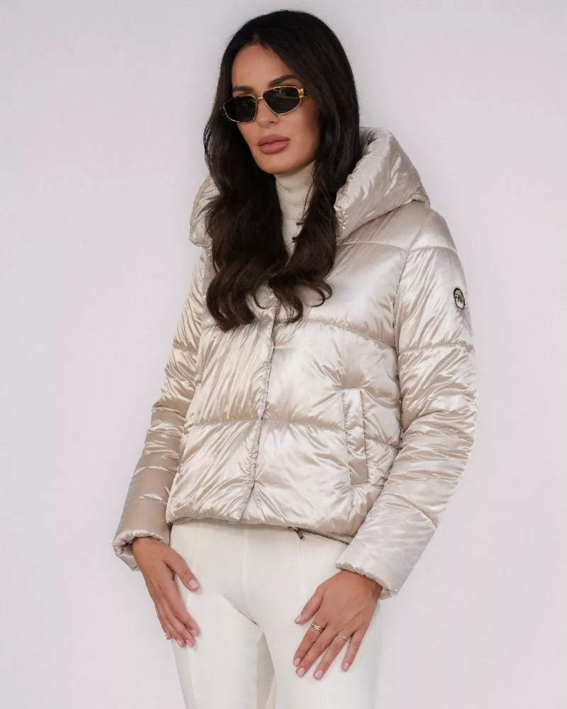 Diese elegante Damen-Daunenjacke in Champagner ist die ideale Wahl für kältere Tage. Ihre kurze Länge von 60 cm schmiegt sich perfekt an den Körper an und sorgt für hohen Tragekomfort im Alltag.