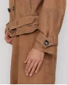 Die Jacke wird mit Knöpfen geschlossen, was ihren klassischen, leicht trenchcoatartigen Charakter unterstreicht. Zu den raffinierten Details gehören geknöpfte Schulterklappen und Zierstreifen an den Ärmeln. Ein separater Gürtel mit Gürtelschlaufen in der Taille sorgt für eine taillierte Passform und betont die feminine Figur.