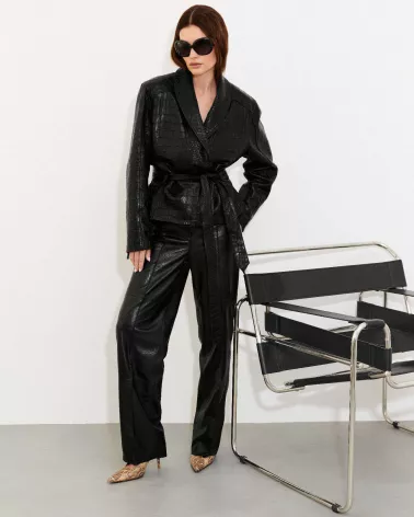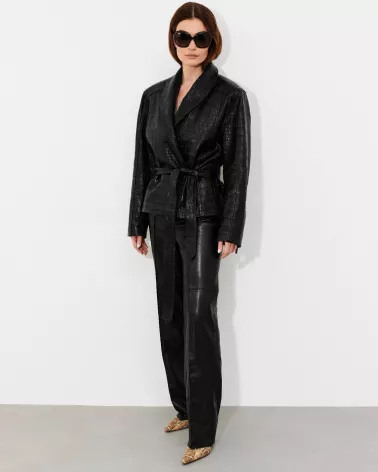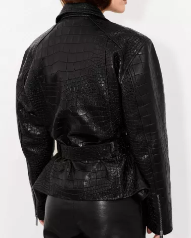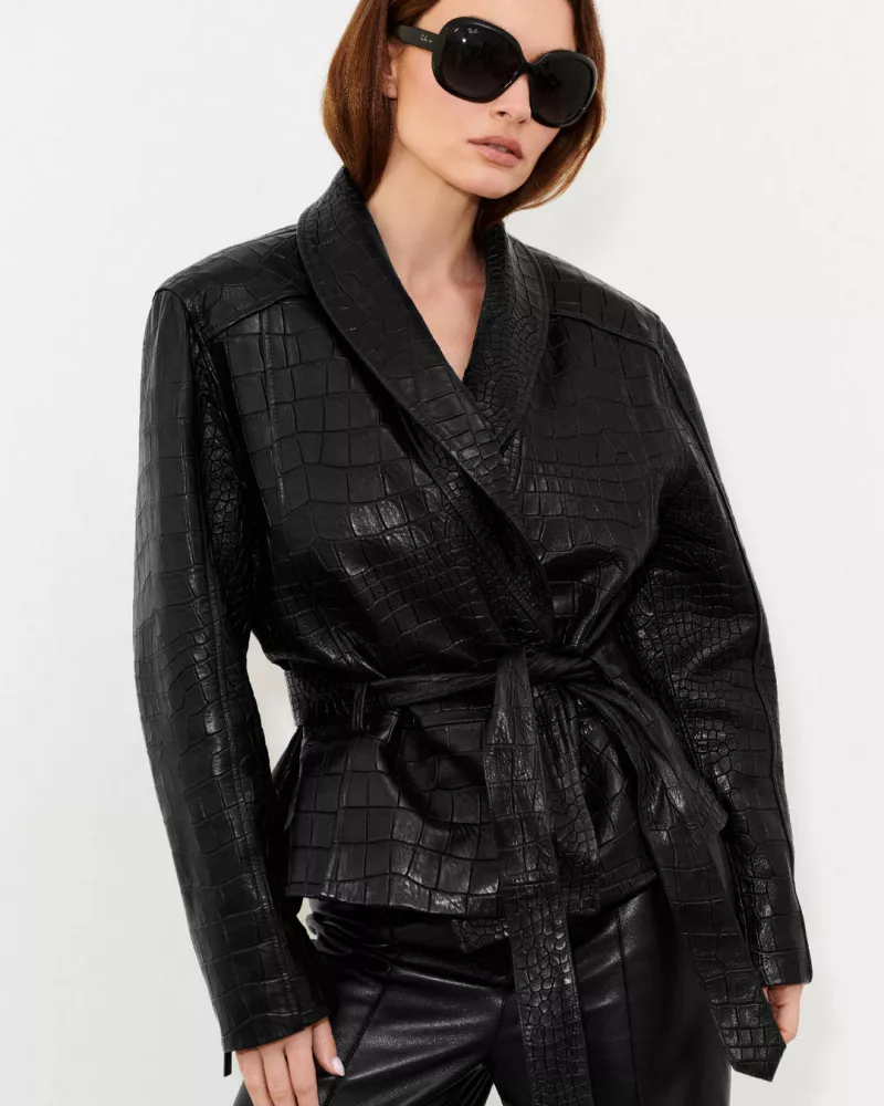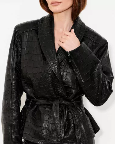 Diese stilvolle Jacke aus hochwertigem, geprägtem Lammleder ist perfekt für Frauen, die Wert auf unverwechselbares Design und zeitlose Eleganz legen. Die modische Oversize-Jacke besticht durch ihre Krokodil-inspirierte Struktur und raffinierte Details, die ihr einen luxuriösen Touch verleihen.
