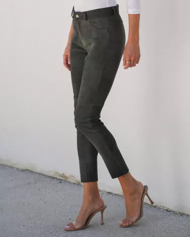 Moderne Khaki-Lederhosen sind eine Kombination aus Komfort, Eleganz und urbanem Stil. Sie bestehen aus 100 % Stretchleder, passen sich der Silhouette perfekt an, betonen ihre Formen und bieten gleichzeitig vollen Bewegungskomfort.