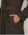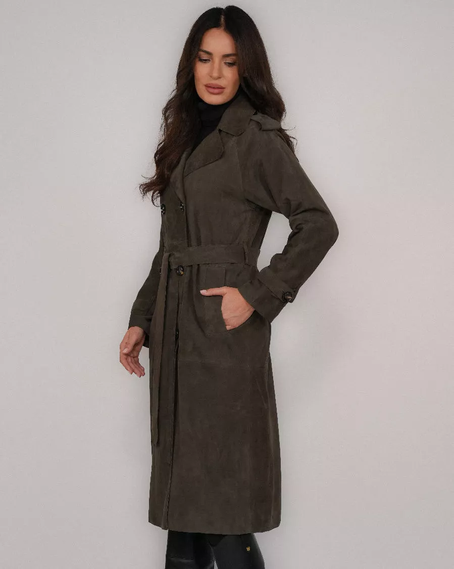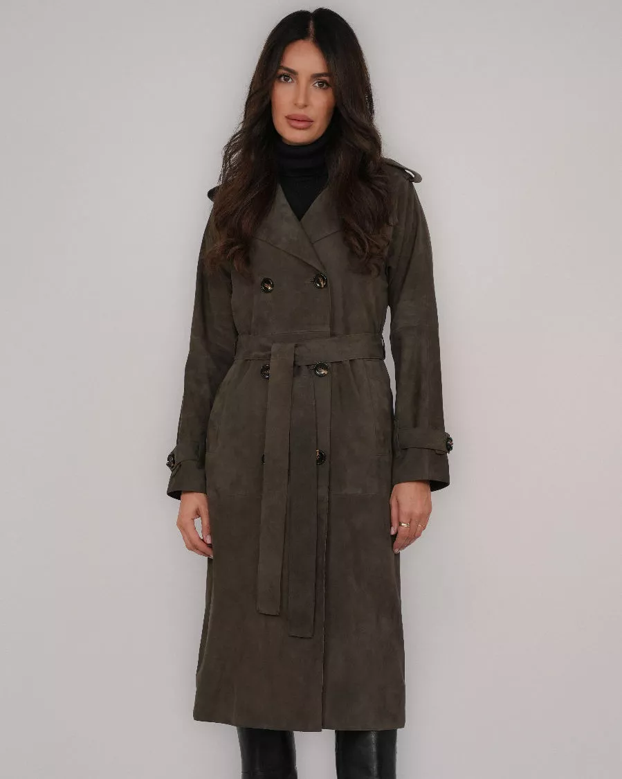 Dieser stilvolle, zeitlose Mantel aus hochwertigem Lammveloursleder ist die perfekte Wahl für kühlere Tage. Das Modell in Dunkeloliv besticht durch seine Eleganz und sein natürliches Finish. Die Oversize-Passform sorgt für Komfort und Bewegungsfreiheit und verleiht gleichzeitig einen schicken Look.