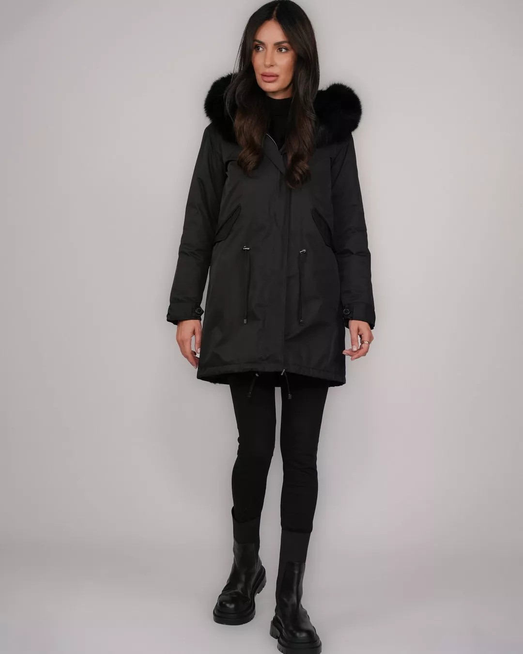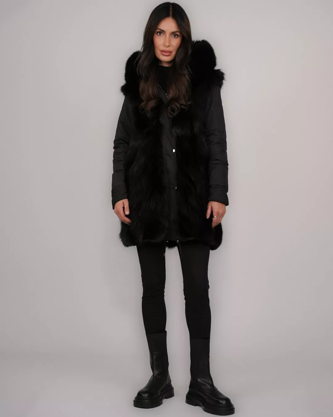 ● Kapuze mit natürlichem Fuchsfellbesatz für zusätzliche Eleganz und verbesserte Wärmeisolation
