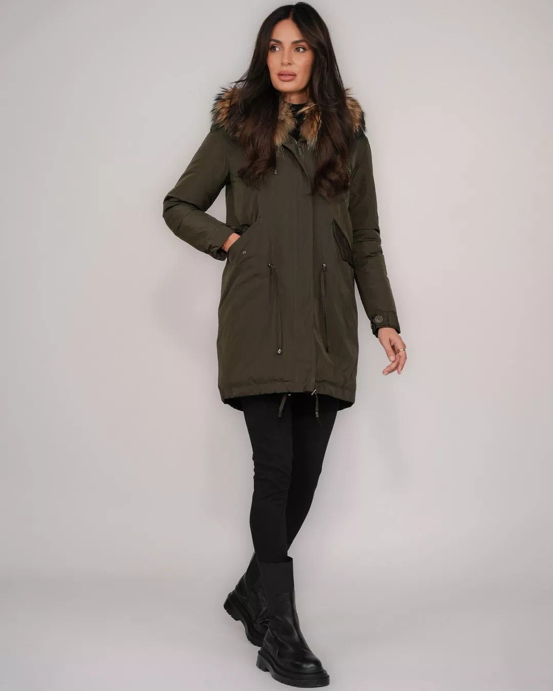 Die Kapuze ist mit naturgetreuem Waschbärfell besetzt, was ihr eine luxuriöse Note verleiht. Die Besatzteile sind abnehmbar, sodass Sie den Stil der Jacke ganz einfach an Wetter oder Anlass anpassen können. Sowohl Kapuze als auch Saum verfügen über verstellbare Kordelzüge für eine individuelle Passform.