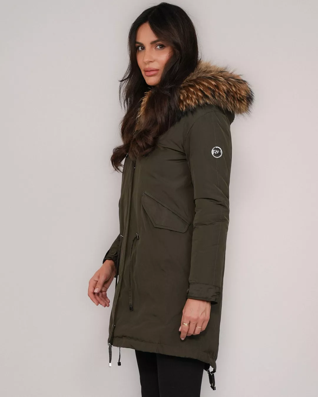 ● Kapuze mit abnehmbarem Waschbärfellbesatz