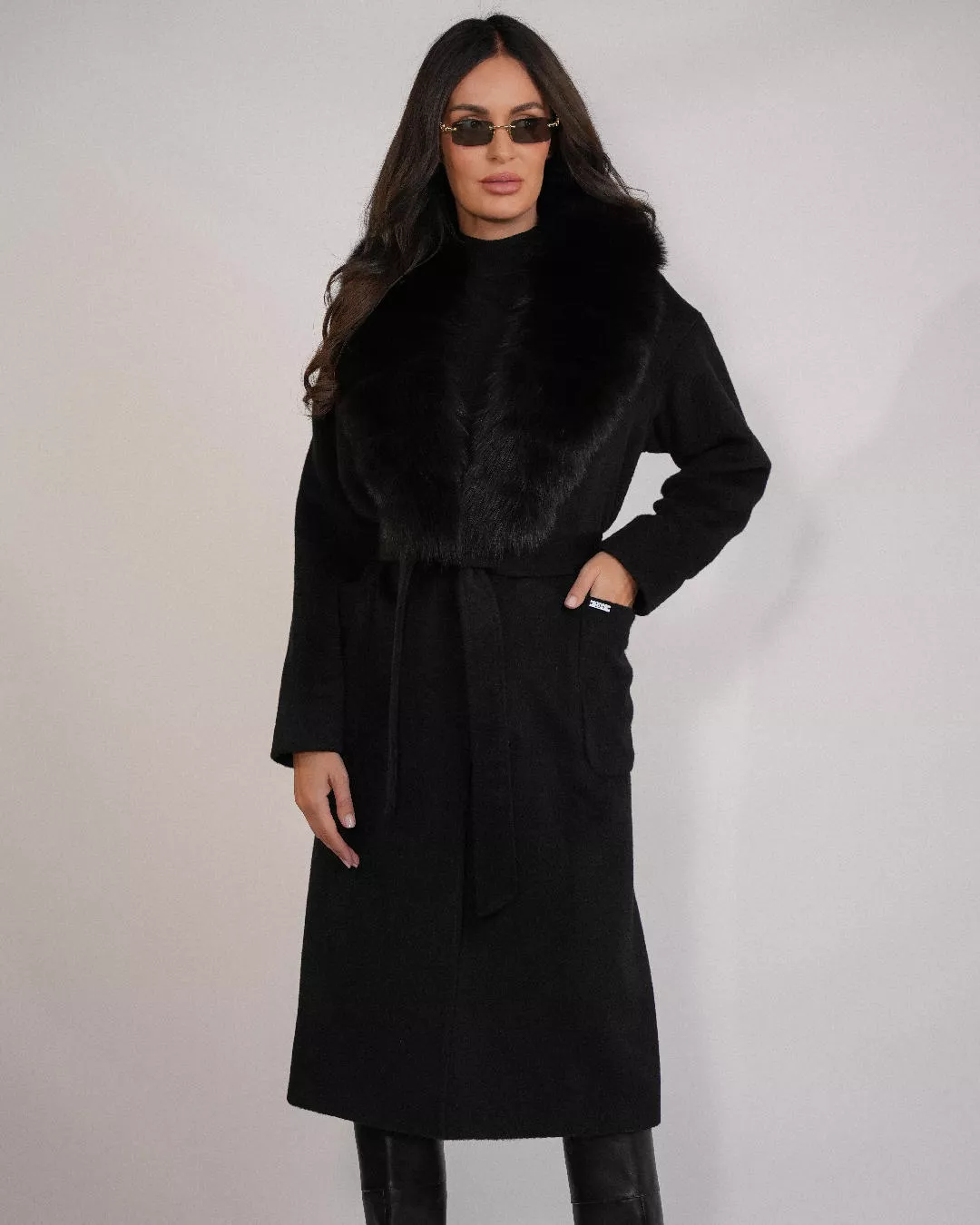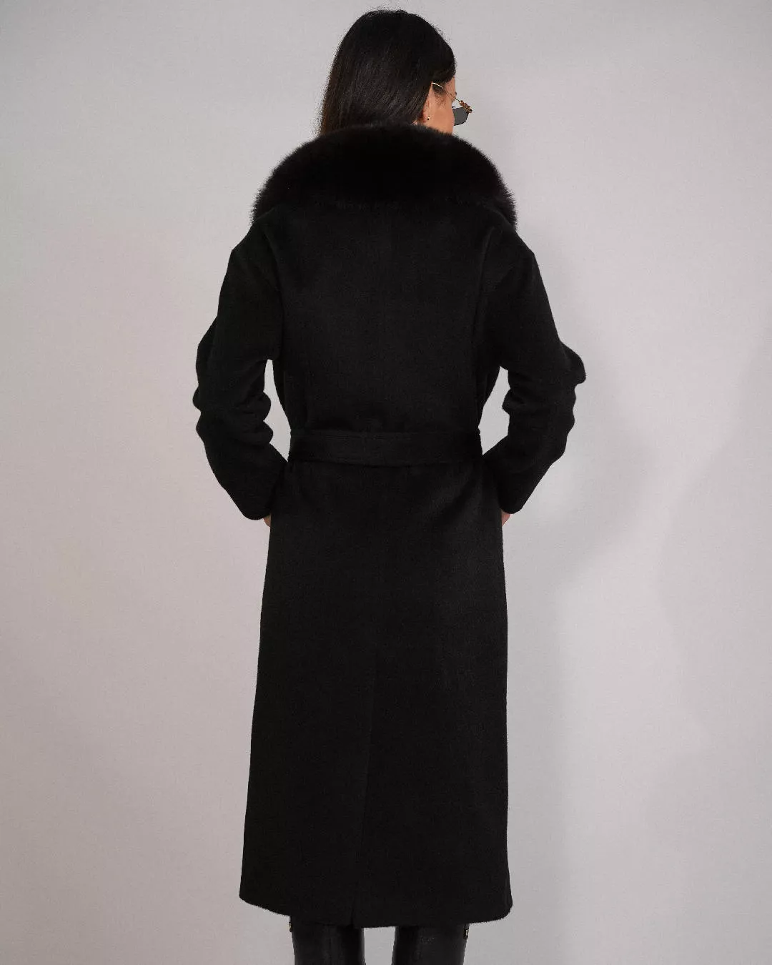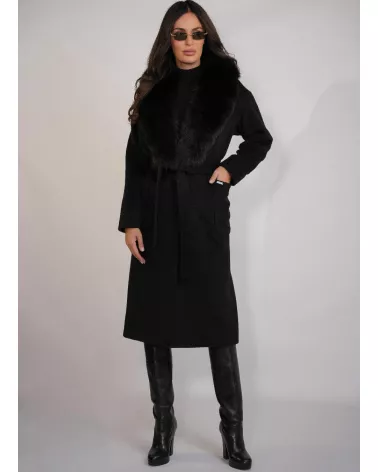 Alpaka-Mantel mit abnehmbarem Fuchspelzbesatz – Schwarz