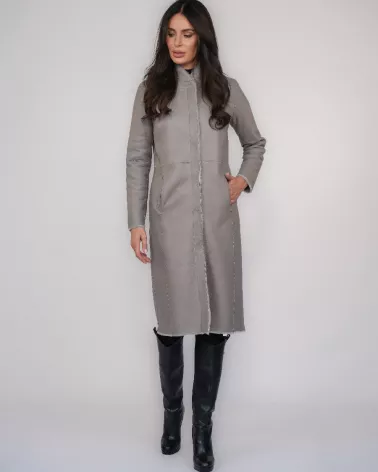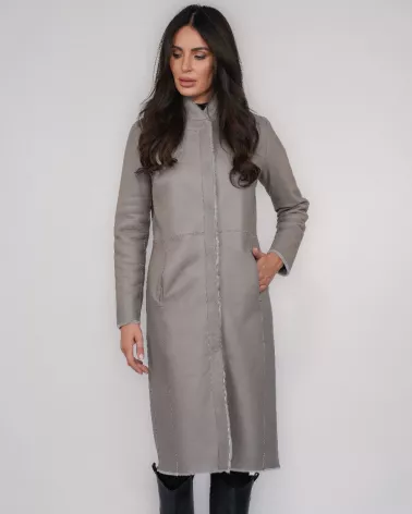 This 110 cm model has a simple, classic cut and is finished with a stand-up collar for added style and effective protection from the cold. The reversible design allows you to wear the coat two ways – with a soft, fluffy finish on one side, and a smooth, leather-like surface in a matte gray on the other.