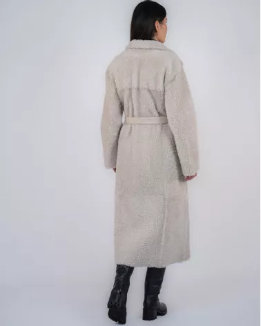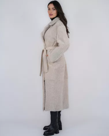At 120 cm in length, the shearling coat provides excellent protection from the cold while beautifully slimming the figure.