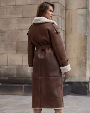 An elegant long sheepskin coat by FAN LEATHER made entirely of merino lambskin in a fashionable walnut color this season is an offer addressed to women who are looking for a kind of compromise between thermal comfort and stylish appearance. It will be perfect even at low temperatures, protecting against cold and wind, and will provide an original look for any occasion.