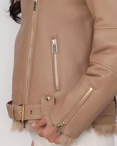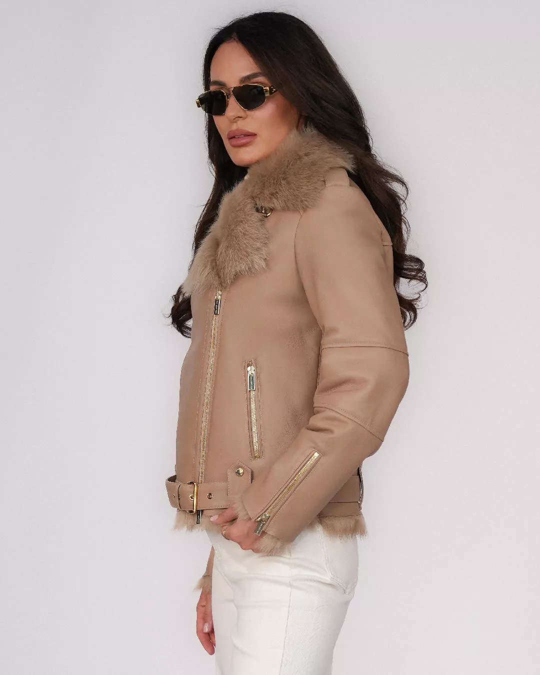 This model features a fitted cut that beautifully accentuates the silhouette while ensuring comfort. The striking, natural sheepskin collar adds elegance and a luxurious look. The coat fastens with a zipper, giving it a distinctive, rock-inspired biker style.