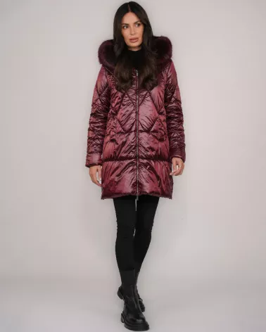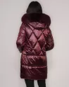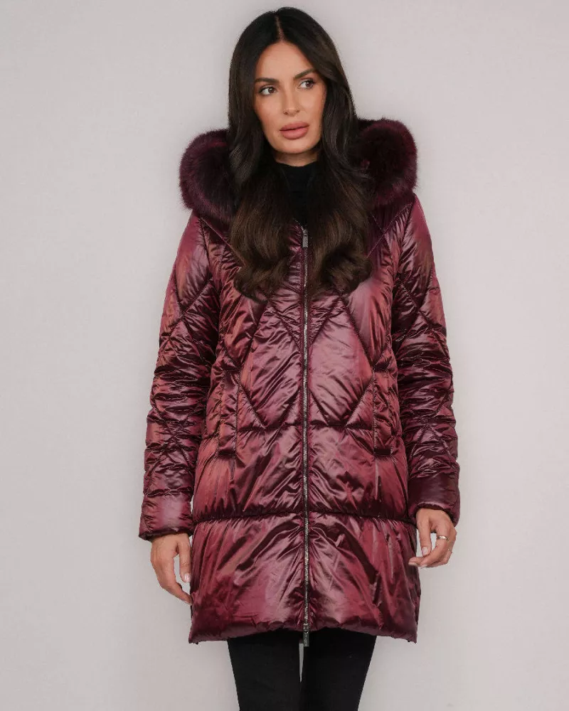This stylish and functional down jacket in an elegant burgundy color is the perfect choice for cold days. It features a shiny finish and a striking hood trimmed with natural fox fur, adding a luxurious touch. The hood trim is removable, allowing you to adapt the jacket's look to the occasion and the weather.