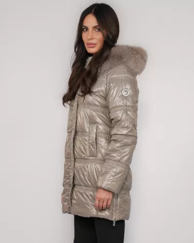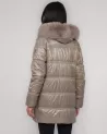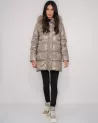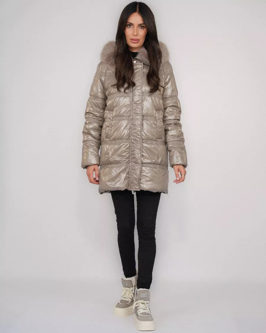 This elegant, warm taupe down jacket is the perfect choice for cold days. The 85 cm long model perfectly combines style and functionality, providing comfort and protection from the cold.