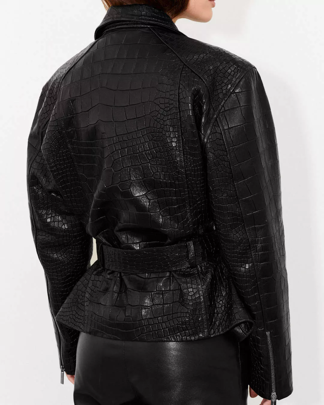 This stylish jacket, crafted from high-quality embossed lambskin, is perfect for women who value distinctive design and timeless elegance. This fashionable oversized jacket boasts a crocodile-inspired structure and refined details that lend a luxurious touch.