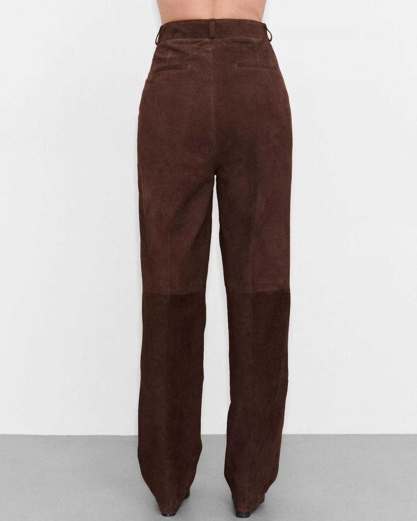 Brown slim trousers made of soft suede leather are the epitome of autumn elegance and warm style. They are perfect for both casual and more elegant styles. Thanks to the elastic material and perfect cut, they guarantee comfort and impeccable appearance all day long.