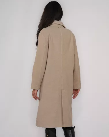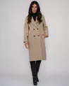 This model features a double-breasted button closure, highlighting the coat's timeless character, and two side pockets for added functionality. The simple cut with a gently fitted silhouette drapes beautifully, creating an elegant and chic look.