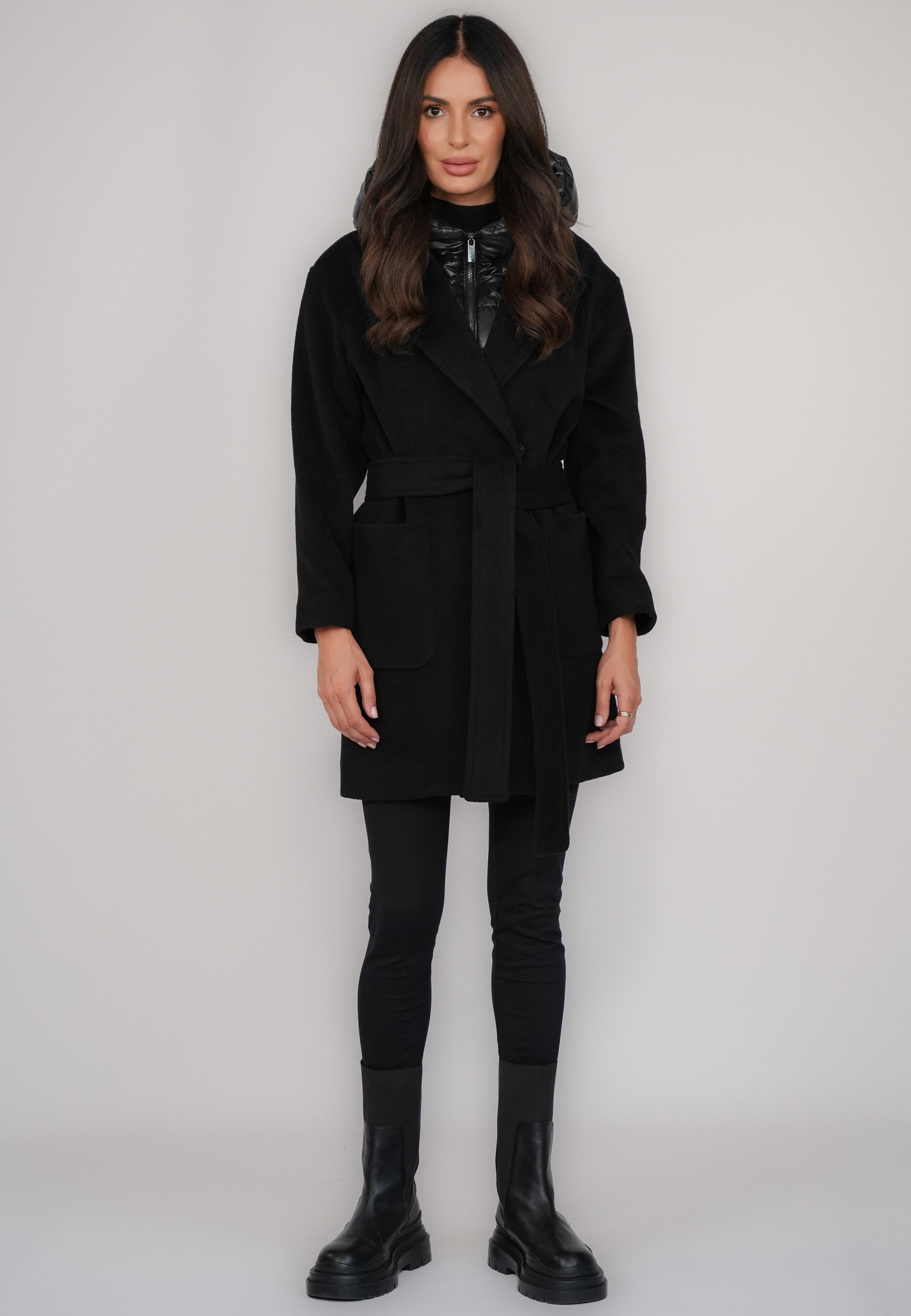 This elegant, loose-fitting coat, made from a high-quality wool and cashmere blend, is the perfect choice for colder days. It features a detachable hooded liner filled with eco-down for added warmth and comfort. This detachable lining makes it perfect for both transitional seasons and winter.