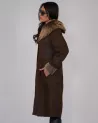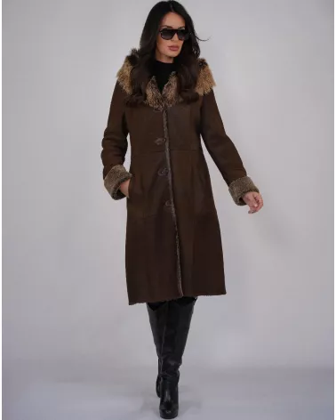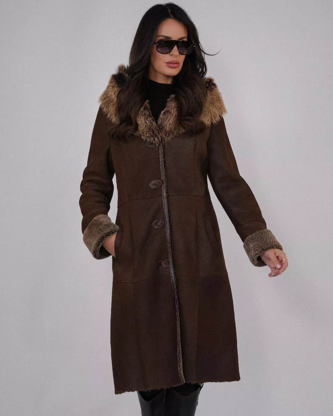 Model posiada praktyczny kaptur wykończony naturalnym futrem, który dodaje całości stylowego charakteru. Zapinanie na guziki podkreśla klasyczną formę kożucha, a dwie funkcjonalne kieszenie zwiększają jego wygodę w codziennym użytkowaniu. Wywijane rękawy pozwalają na indywidualne dopasowanie długości oraz efektowne wyeksponowanie miękkiego wykończenia.