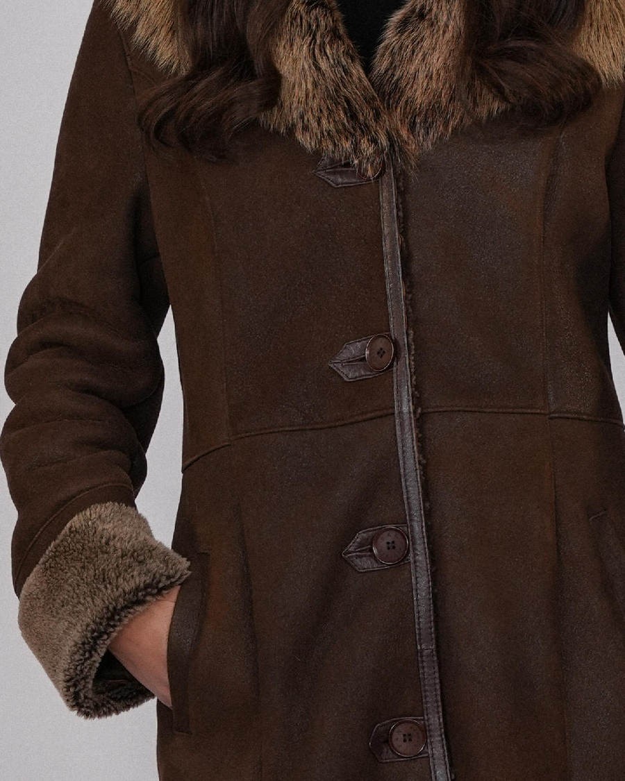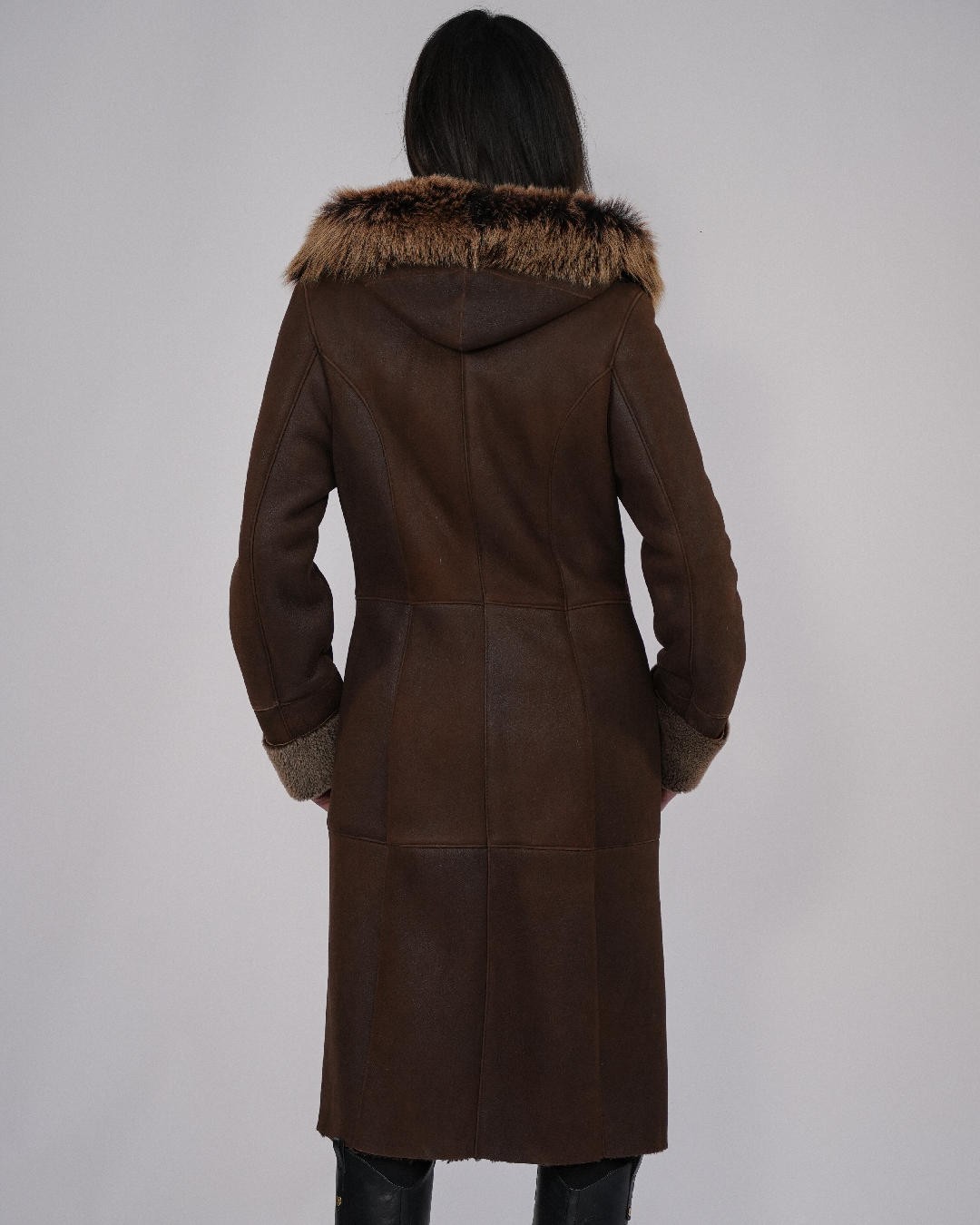 Model posiada praktyczny kaptur wykończony naturalnym futrem, który dodaje całości stylowego charakteru. Zapinanie na guziki podkreśla klasyczną formę kożucha, a dwie funkcjonalne kieszenie zwiększają jego wygodę w codziennym użytkowaniu. Wywijane rękawy pozwalają na indywidualne dopasowanie długości oraz efektowne wyeksponowanie miękkiego wykończenia.