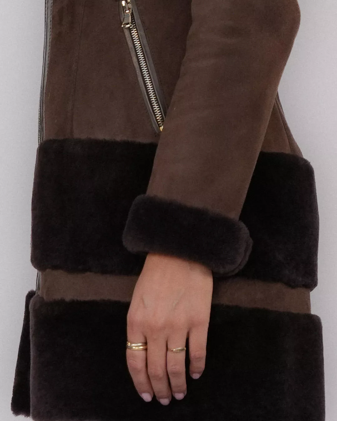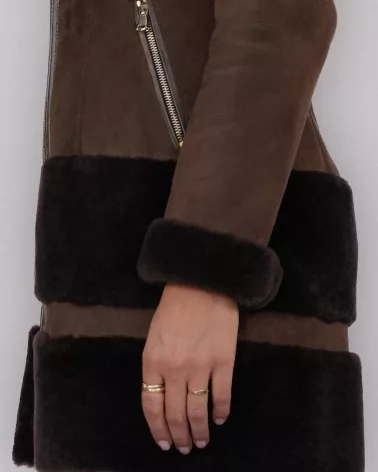 Kożuch zapinany jest na solidny zamek błyskawiczny, co gwarantuje wygodę i dobrą ochronę przed zimnem. Dół oraz kołnierz zostały wykończone naturalnym futrem, które dodaje całości luksusowego charakteru i podkreśla elegancki styl. Praktyczna stójka chroni szyję przed wiatrem, a wywijane rękawy pozwalają na indywidualne dopasowanie długości.