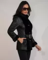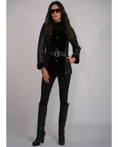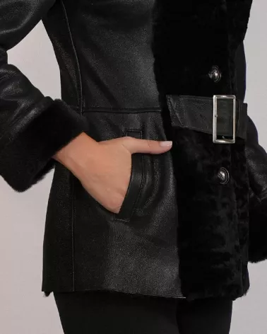 Kożuch posiada taliowany fason, który pięknie podkreśla sylwetkę. Przód wykończony naturalnym futrem nadaje całości szlachetnego charakteru i zwiększa walory termiczne. Model zapinany jest na guziki, a dodatkowo wyposażony w pasek z klamrą, umożliwiający indywidualne dopasowanie w talii. Szalowy kołnierz dodaje elegancji i subtelnie otula szyję.