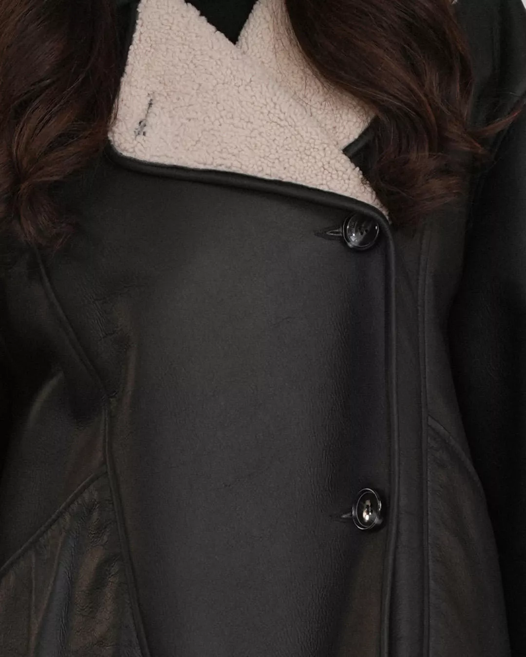 Kożuch zapinany jest na guziki, co podkreśla jego klasyczny charakter. Wyposażony w dwie naszyte kieszenie, które są praktyczne i jednocześnie stanowią element dekoracyjny. Kontrastowe, jasne wykończenie od wewnątrz dodaje całości wyrafinowanego wyglądu i zapewnia komfort cieplny w chłodniejsze dni.